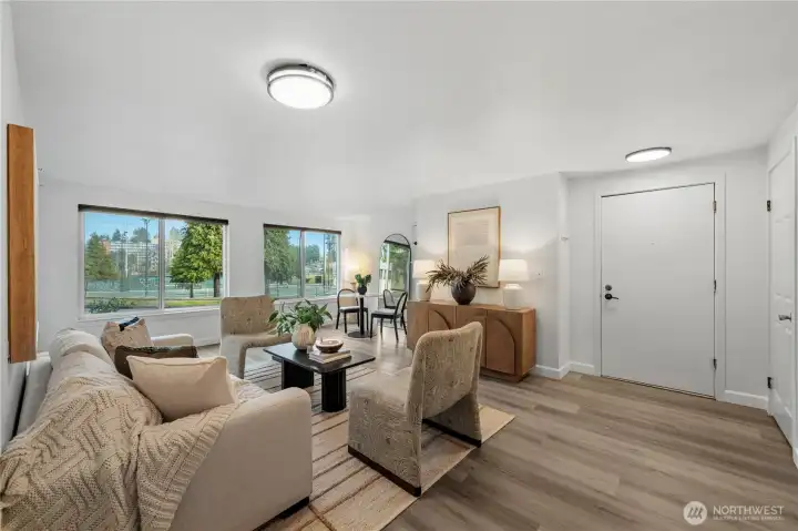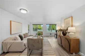 Bursting with natural sunlight this one level corner unit overlooks the park with a private balcony. Remodeled kitchen in 2024 features quartz countertops, stainless appliances and soft close white shaker cabinets along with new luxury plank flooring bringing the modern touch to this home. 2nd floor unit with no other units under this unit. Plenty of storage, both in the unit and with an extra storage cage. Secure access building with an elevator and secure garage parking. Your plants will thrive here. Easy commuter options along the bus line and quick access to I-5 and Aurora for getting downtown.