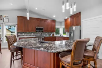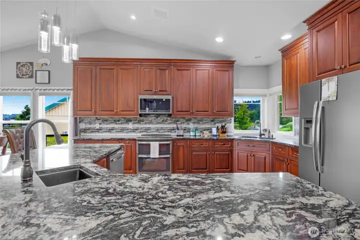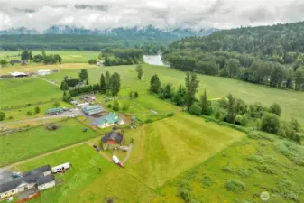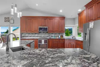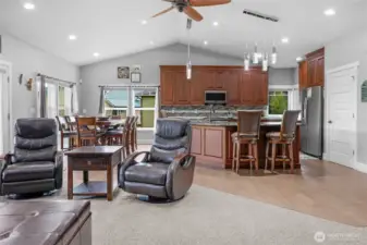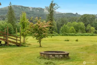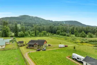 Peaceful 3.7-acre Monroe rambler w/ stunning mountain views & peek of Skykomish River. 'Great Room' layout shines w/ vaulted ceilings, walls of windows, custom propane FP, & open flow from living to dining to gourmet kitchen—featuring powered island, walk-in pantry, & custom cabinetry. Large patio off 'Great Room' is perfect for BBQs, stargazing, or coffee w/ the birds. Primary suite offers private patio access, 5-pc ensuite w/ soaking tub, walk-in shower, & extra large closet. French doors open to 3rd bed, ideal for office/studio. Formal living room adds flexible space. Efficient radiant floor heating. Outside: 20x20 powered shed, raised garden beds, 2-car attached garage, private well w/ new water system—comfort, beauty & room to roam!