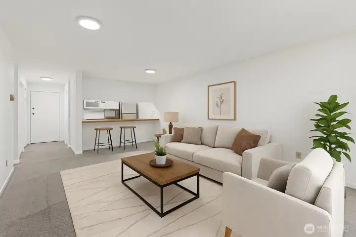 Welcome to Harrison Court Condos—beautifully maintained and ideally situated between Maple Leaf and Northgate! Enjoy quick access to light rail, the Kraken Iceplex, shopping, and dining. This secure, pet-friendly unit features an open layout with a bright living room, wood-burning fireplace, and private balcony with storage. The primary bedroom includes a walk-in closet and full bath, while the second bedroom works perfectly for guests or a home office. A second full bath and in-unit full-size W/D add everyday convenience. Fresh interior paint and new carpet make this home move-in ready.