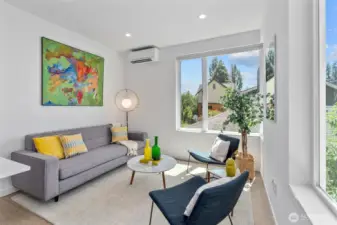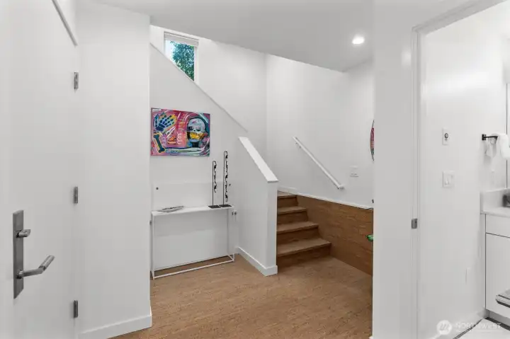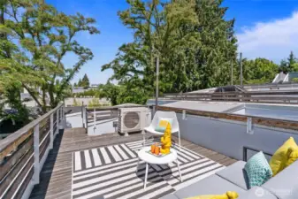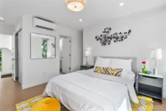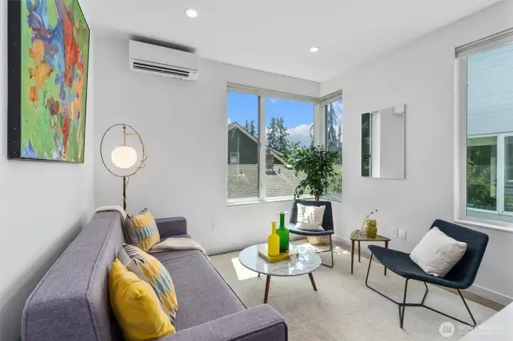 Like new townhome in the highly desirable Fremont-Wallingford corridor. Bright and contemporary, this gProjects built home combines modern flair with abundant natural light from floor-to-ceiling windows. Enjoy sweeping city and Lake Union views from your private rooftop deck. The smart three-level layout places the primary suite upstairs, the living area and a stylish kitchen on the middle level, and a second bedroom with a full bath on the ground floor. Crisp finishes, a skylight-lit stairwell, and a fashionable vibe complete the package. Cork hardwoods deliver warmth, sustainability, and excellent thermal and acoustic insulation. Ductless mini-split systems provide efficient heating and cooling for year-round comfort. Washer & dryer included. Steps to beloved restaurants, cafes, and the Burke-Gilman Trail. Reserved monthly parking across the street, prepaid thru Mar '26. Inquire about rate buydown options. Don’t miss this opportunity!