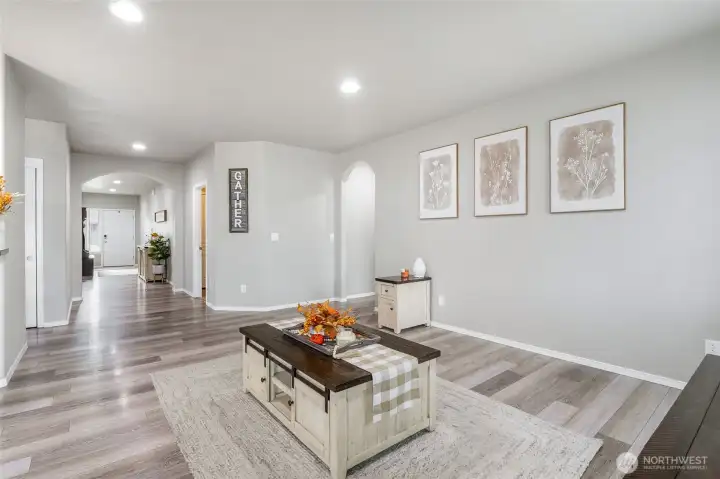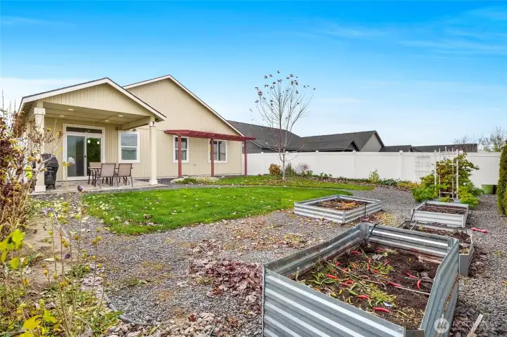 Charming and move-in ready, this 3-bedroom, 1.75-bath home offers a warm, welcoming layout and fantastic outdoor space. Step inside to an open-concept great room with a dining area, breakfast bar, and easy-flow design. The spacious primary suite includes a walk-in closet, dual sinks, and a private 3/4 bath. Outside, enjoy a fully fenced yard with beautiful landscaping, raised garden beds, and a covered patio perfect for year-round relaxation. The finished 2-car garage with extra depth provides added storage and convenience.
