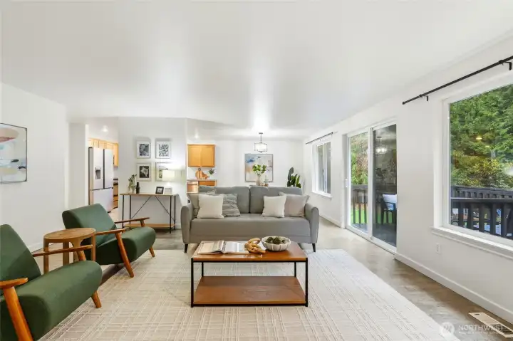 Situated in a quiet cul-de-sac and backed by evergreens, this spacious Lake Tapps home offers comfort, privacy and over 2,000 square feet that lives like a single family home. The main level feels bright and welcoming with fresh paint, modern lighting, and new kitchen appliances. The primary bedroom is conveniently located on the main floor with a double vanity. Upstairs, two bedrooms provide flexible space for guests, work, or play. The finished lower level adds a generous bonus room, new flooring, and a large flex area. Enjoy a fully fenced yard, a new furnace, a newer heat pump, a newer water heater, and the HOA that covers water, septic, front yard care, and private lake access at nearby Jenks Park. Imagine the life you’ll create here!