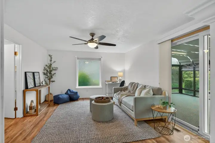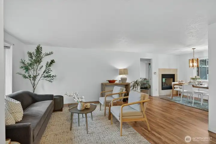 Welcome to effortless one-level living in the heart of Skyline with a layout that simply lives well. Living room flows into dining area, while well-appointed kitchen offers abundant cabinetry, pantry, generous skylight & pass-thru that makes hosting & everyday meals a breeze. A second living/rec room extends the home’s versatility, anchored by 2-sided fireplace & offering laundry, access to 2-car garage & slider opening to expansive sunroom. Outside is fenced backyard, ideal for garden lovers, pets or relaxed outdoor living. Three comfortable bedrooms include full bath & 3/4 bath, giving room for flexible use. Perfectly positioned to enjoy all amenities: play courts, beach club, nearby beaches & marina with quick access to Wa Park & ferry.