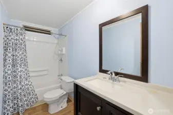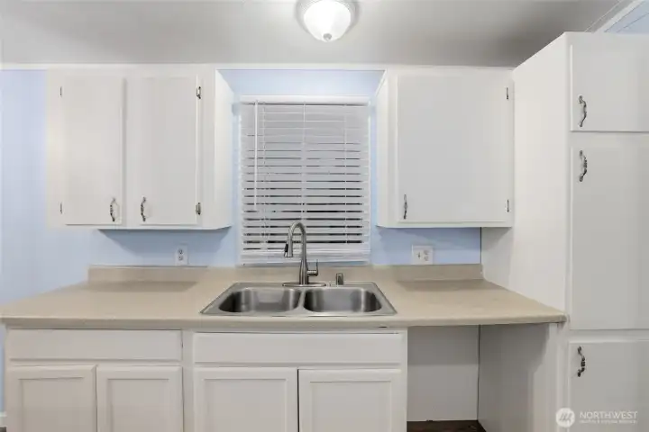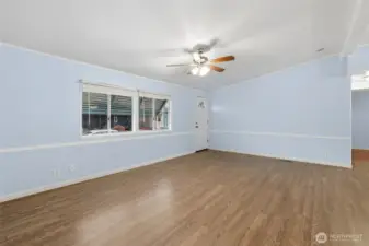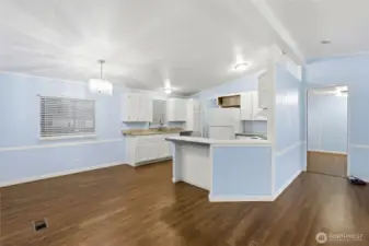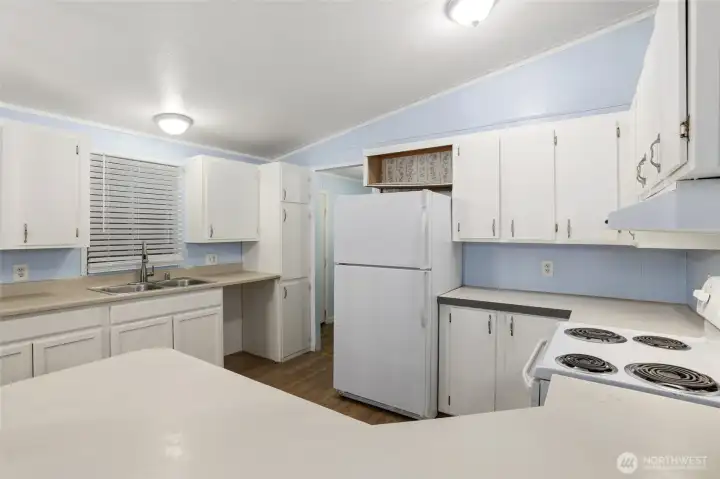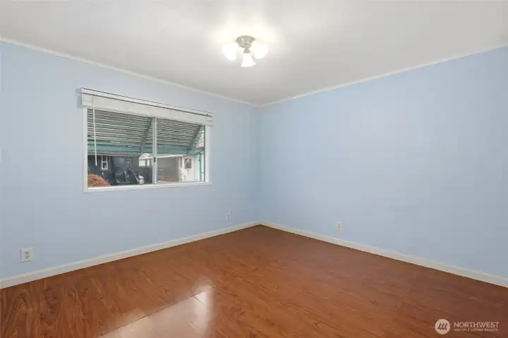 Welcome to this lovely 3 bedroom home at Crystal Vista Park. New roof installed July of 2025 w/ 50 Year warranty! New interior and exterior paint and new flooring throughout. Large, open concept living room with vaulted ceilings and large kitchen with dining space. Kitchen features beautiful white painted cabinetry, and a breakfast bar peninsula. Spacious primary suite includes its own private bath for added convenience, and walk-in closet. Two additional bedrooms feature large closets and are filled with natural light. Covered carport with storage space, as well as large storage shed on the exterior of the home. Close proximity to shopping, schools, transit, and easy access to I-5!