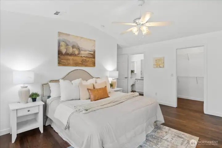 Daylight floods the home through oversized windows/skylights & the sunrise-facing balcony is a great spot for morning coffee. The living room & primary suite both have vaulted ceilings & nearly every surface has been updated w/ over 55k in key improvements. The opened kitchen brings quartz counters, full backsplash, upgraded cabinetry w/ new hardware, added pantry storage in the dining area & a newer oversized fridge. Engineered hardwood runs through the entire home w/ no carpet, paired w/ fresh paint, new thick trim, updated baths & top-down bottom-up blinds that balance light and privacy. Private driveway & one-car garage w/ guest parking directly across the street, plus laundry on the main level. Mins to Stanwood amenities & transit.