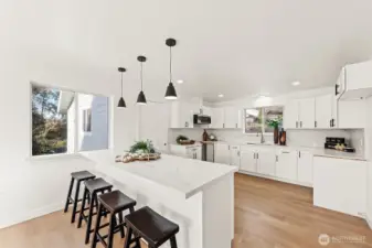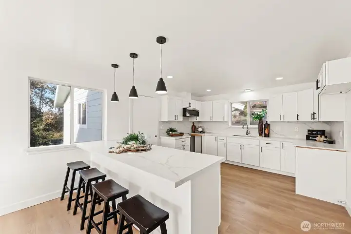 Beautifully updated 6 bed/3 bath home in Seward Park! Energy-efficient heat pump with A/C provides comfortable and cost-effective heating and cooling year-round, newer roof, new sidings, vinyl flooring &large windows for great natural light.Fully remodeled main kitchen w/ new cabinets, countertops, SS appliances & LED lighting. The fully finished basement offers exceptional flexibility w/ a family room,3 beds, an office, 3/4 bath, and a separate entrance—ideal for MIL (ADU potential). Fireplaces on both levels. Enjoy the back deck w/ views off the kitchen for easy indoor/outdoor dining. Spacious fully fenced yard plus 2-car garage. Near Pritchard Beach,parks,transit, cafés, shops, schools & light rail.Oil tank professionally decommissioned.