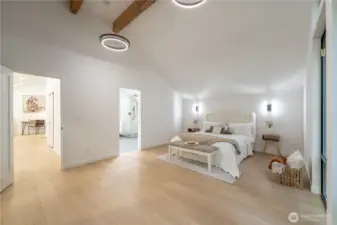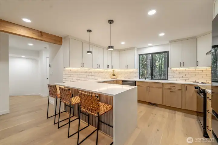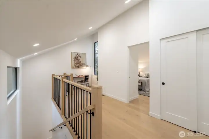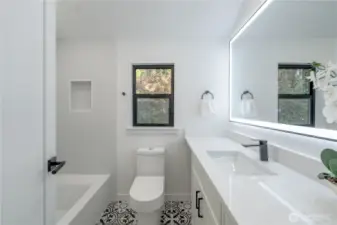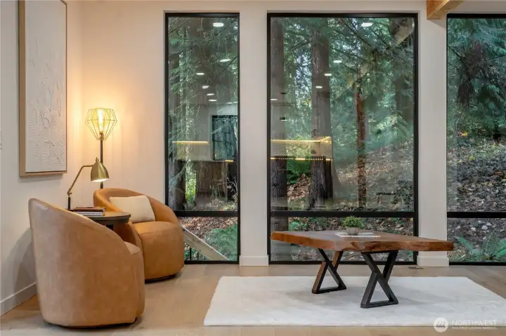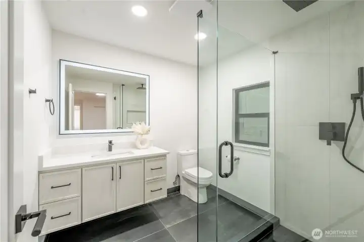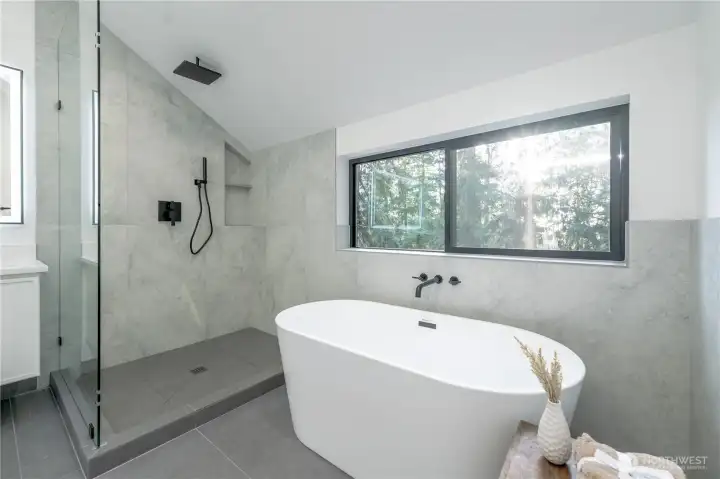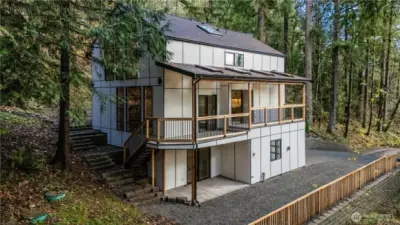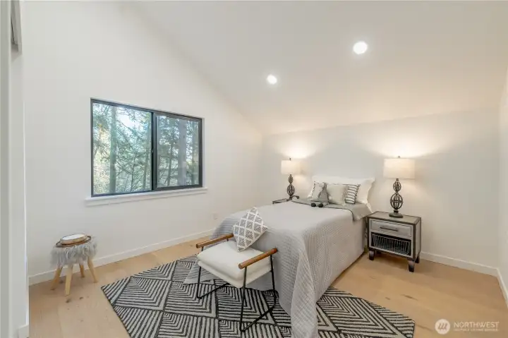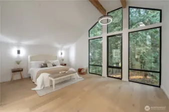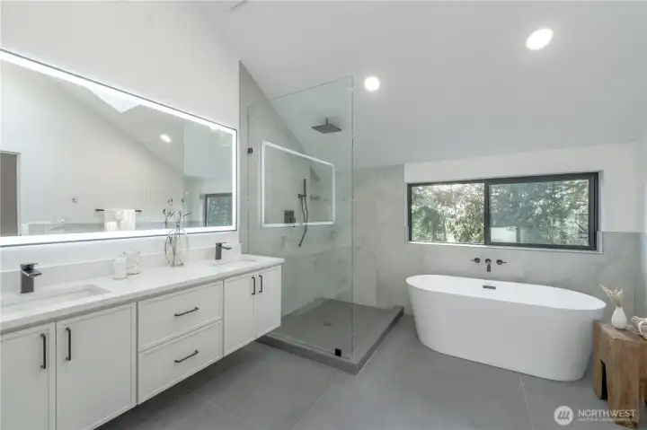 Exceptional one-of-a-kind 3 bed, 3.25 bath, & 2,430sqft Mirrormont residence on private 0.86 acres. Gourmet kitchen dazzles with quartz counters, full backsplash, rich brown lower & crisp white upper custom cabinetry, all appliances & dual oversized pantries. Sun-drenched living room with soaring floor-to-ceiling windows + fireplace. Second primary suite on main living level with ¾ bath & west side wrapped entertainment deck. Top-floor primary sanctuary boasts 13ft vaulted ceilings, dual chandeliers, wall-of-windows, luxurious walk-in closet with premium custom built-ins, & spa bath w/ freestanding tub, dramatic skylight, tiled rain shower, double floating vanities & heated floors. Lower family room & epoxy-finished 2-car garage. Come Tour!