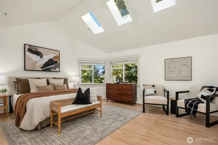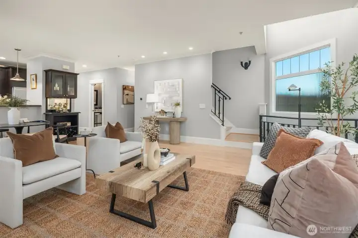 Sophisticated Capitol Hill townhome, where classic meets contemporary. Freshly refinished gleaming maple hardwood floors, radiant in-floor heating, and fresh paint welcome you. The chef's kitchen offers sleek granite surfaces, a high-end Wolf range, and generous pantry space. Escape to the primary retreat, with soaring vaulted ceilings, two generous walk-in closets, a serene spa bath, and a secluded office alcove. Savor panoramic city vistas from the rooftop deck, or unwind on the balcony and rear patio. Rare two-car garage and bonus storage. Mere blocks to Volunteer Park, a quick stroll to lively 15th and Broadway dining and boutiques, plus seamless light rail and highway connections. Walk Score 97—effortless city living redefined.