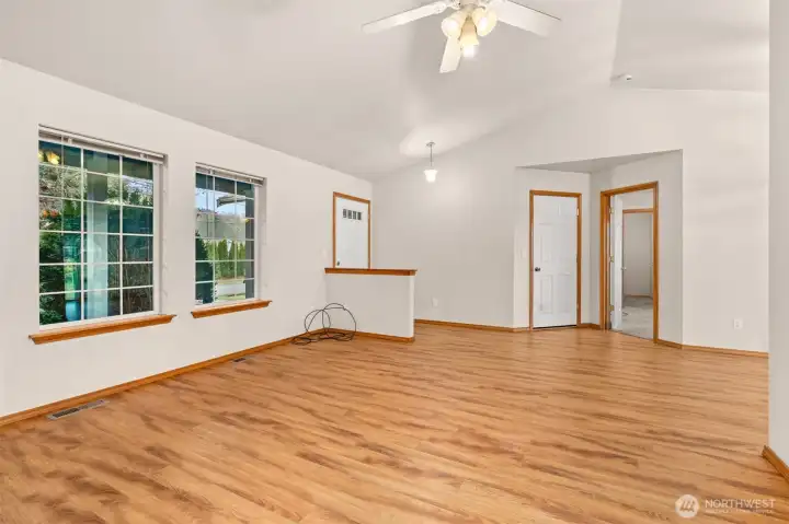 Welcome to this inviting single-story home featuring a charming covered front porch and vaulted ceilings that open up the living room. An easy-flow kitchen connects to a formal dining space, perfect for gatherings. The private primary suite includes a walk-in closet, while two additional bedrooms and a full bath offer flexibility for guests or home office needs. Enjoy an attached two-car garage and a fully fenced backyard with a pergola and patio—ideal for relaxing, entertaining, or play. Move-in ready and designed for comfortable living!