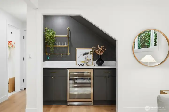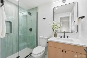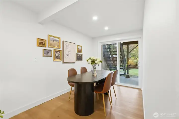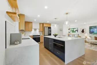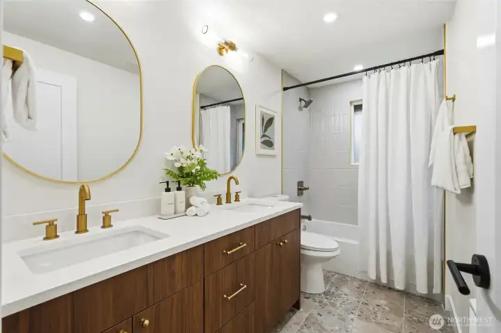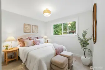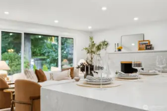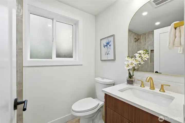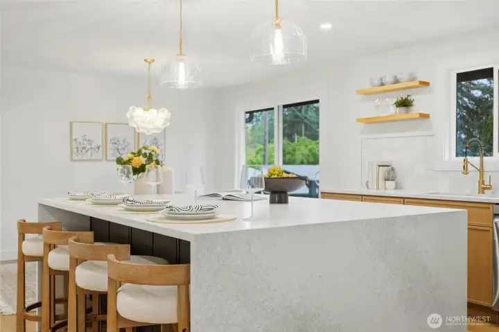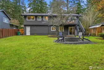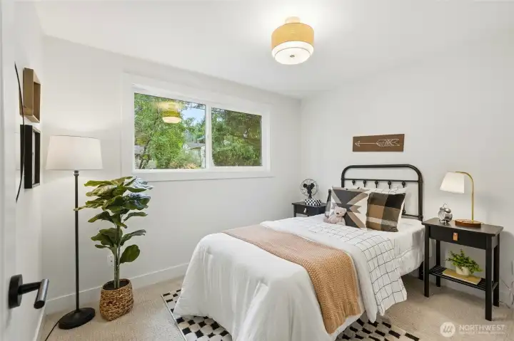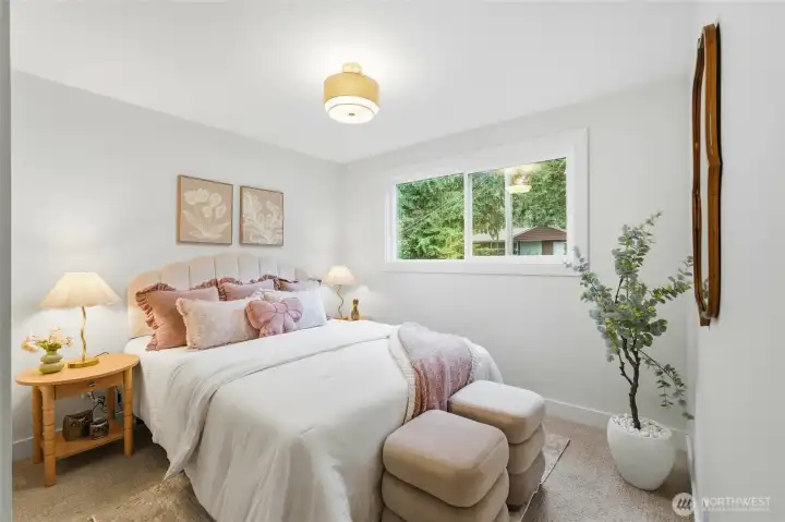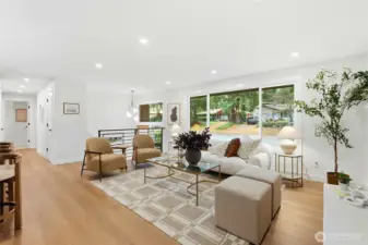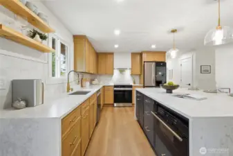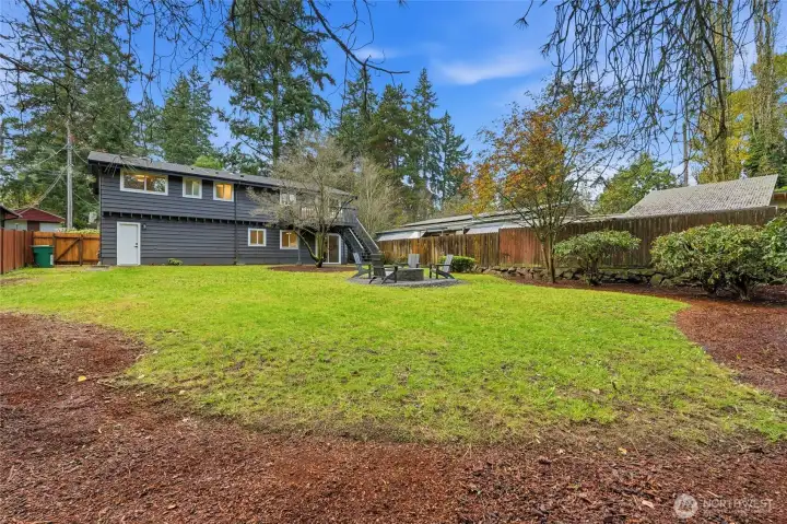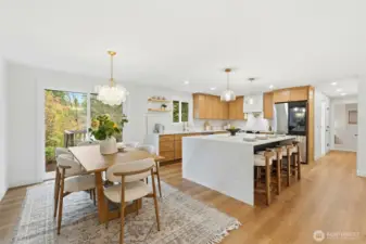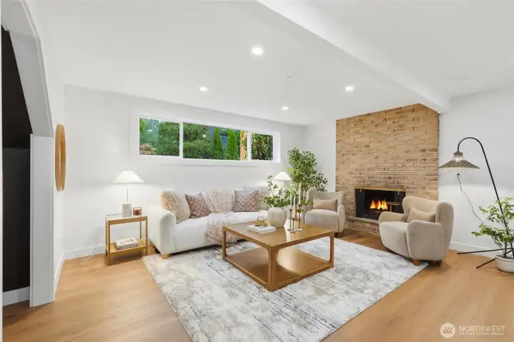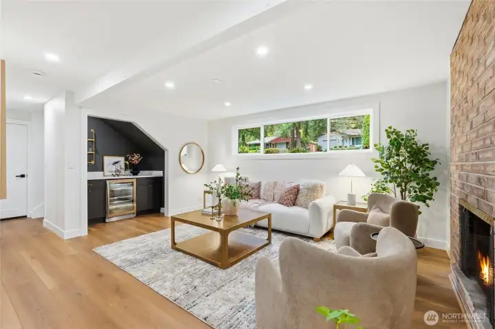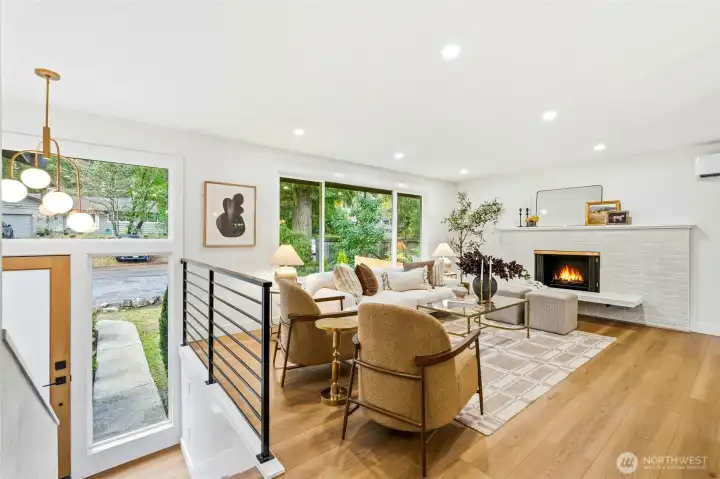 Beautifully updated North Seattle home boasting a brand-new kitchen, roof, windows, WH and more. Light-filled open main floor with a designer two-tone kitchen and oversized double-sided island—ideal for cooking/food prep and gathering. Upper level hosts a primary ¾ suite, two bedrooms, and a stylish full bath with dual vanity. The lower level adds a generous family room with bar and wine cooler, plus a 4th bedroom, full bath, and laundry. Step out to the deck overlooking a large, level backyard with a wood-burning fireplace, perfect for cozy nights and daytime play. Ductless Mini Splits provide heat and AC. Attached 2-car garage completes the home.