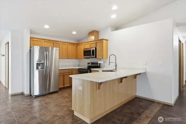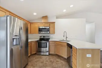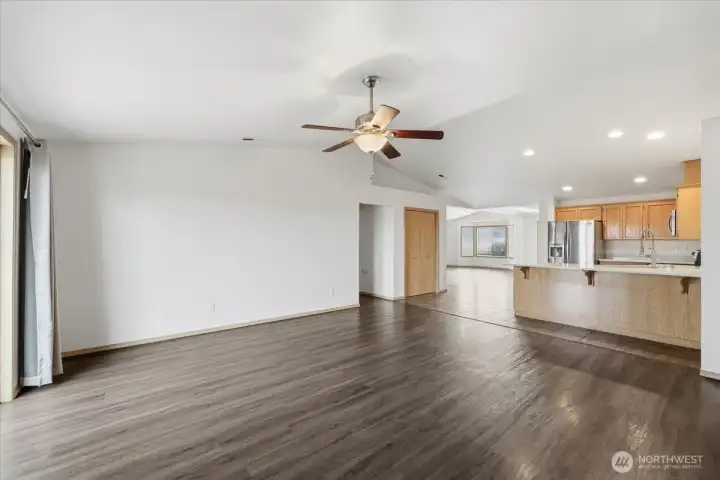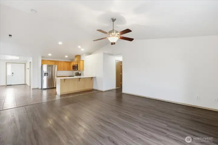 Turn-key home offering desirable main-floor living and an open-concept great room with newer LVP flooring and brand-new carpet in the bedrooms. The spacious kitchen features newer quartz counters, ample cabinetry, and a large eating bar. Fresh professional interior paint throughout, including the oversized, finished 3-car garage with extensive overhead storage. The primary ensuite boasts a walk-in closet and a 5-piece bath with soaking tub, separate shower, and double sinks. Enjoy the large backyard deck overlooking peaceful designated green space. Additional highlights include a roomy laundry area with oversized work sink and a central location just minutes to downtown, Fairchild AFB, shopping, and dining.