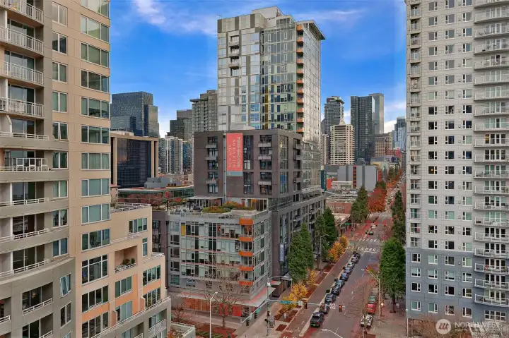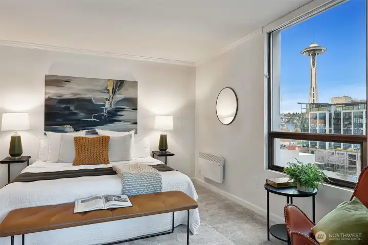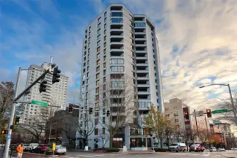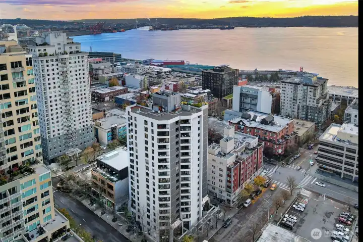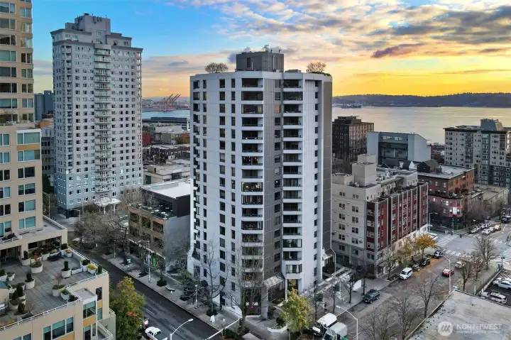 Step inside and you’ll appreciate the style and functionality offered in this bright and airy SE facing corner unit on the 12th floor. Oversized windows, new paint throughout, new carpet in the bedroom and bamboo floors make a strong first impression. The large private balcony is certainly a knockout feature with Space Needle and city views but don't forget about the secured parking, storage unit and in-unit laundry. This building also has a rooftop view deck great for grilling in the summer, an outdoor pool, hot tub, sauna, community room and gym. Step outside to all the best Belltown has to offer, a few minutes walk to Amazon, SLU, downtown, the waterfront, Pike Place Market and restaurants and coffee shops on every block.