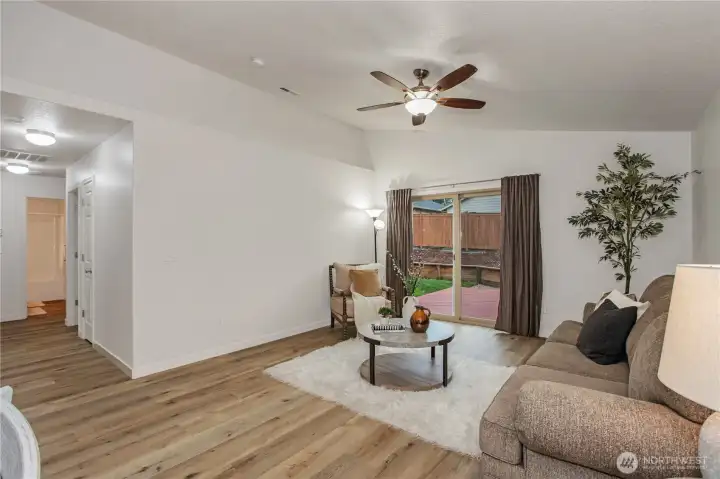 Welcome to this stunning Rambler showcasing 4 bedrooms and 1.75 baths, thoughtfully designed for both comfort and functionality. Step inside to discover newly installed LVP flooring, a freshly painted interior, and a new kitchen laminate countertop. The open-concept living area is highlighted by a vaulted ceiling, creating an airy and inviting atmosphere. Enjoy the fully fenced yard with a sprinkler system for easy maintenance and AC-ready setup for added convenience. Perfectly situated in the desirable Hawks Prairie community just minutes from trails, Tolmie State Park, restaurants, shopping, and 20 minutes to JBLM! A beautiful home in a prime location—ready for you to move in and enjoy!