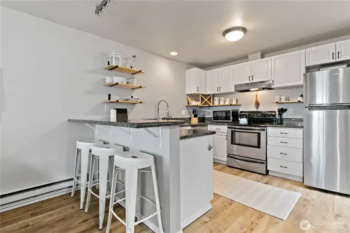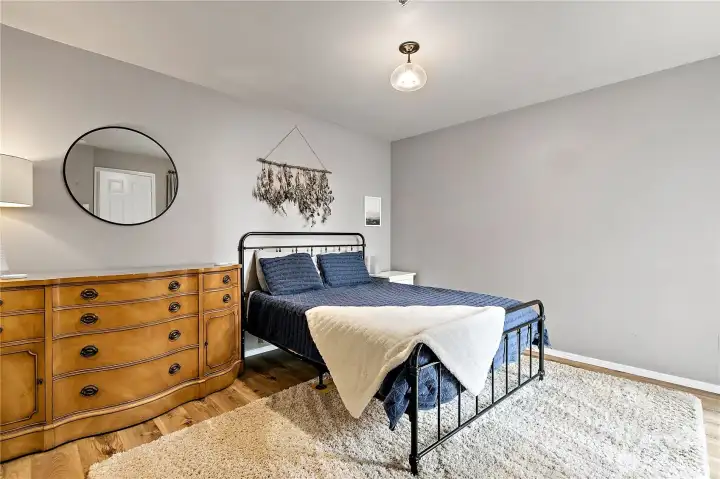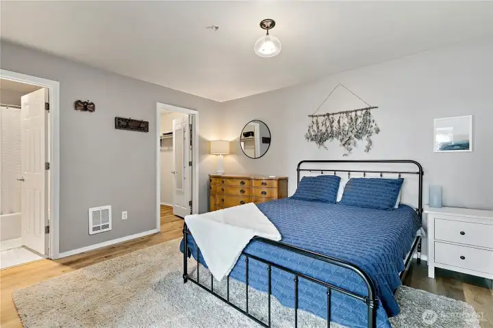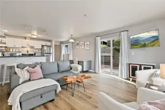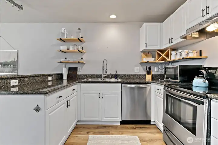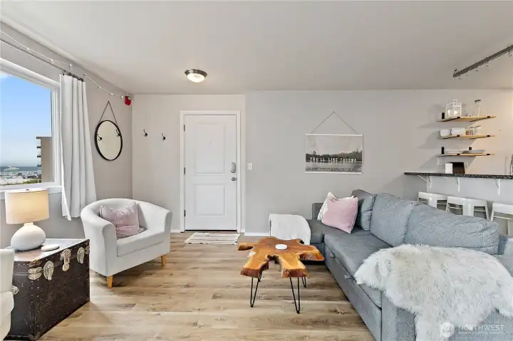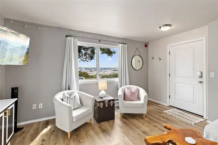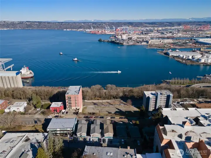 Discover urban living at its finest in this beautifully maintained downtown Tacoma condo! Boasting views of Commencement Bay, and the Port of Tacoma, this ground-floor unit offers a seamless single-story layout with spacious living areas, brand new laminate flooring throughout, and a gourmet kitchen featuring granite counters and stainless steel appliances. The primary bedroom is a retreat with a walk-in closet, private patio access, and a stylish jack-and-jill en-suite. HOA dues cover water, sewer, and refuse.