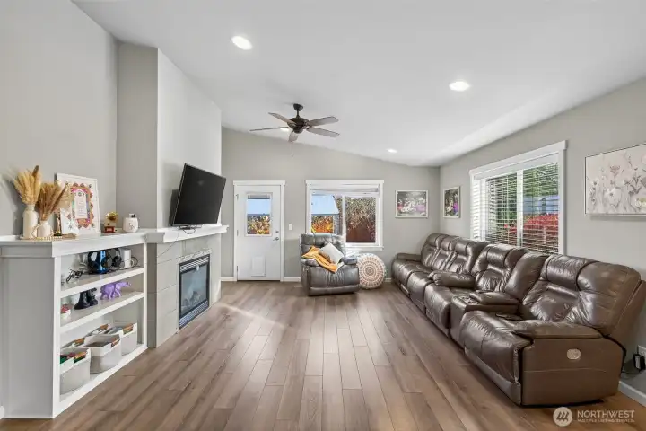 Enjoy single-story living in this thoughtfully crafted 3BD/2BA home. A zero-step entry welcomes you into a bright, open layout featuring vaulted ceilings, skylights, and vinyl plank flooring. The open-concept kitchen shines with beautiful countertops, a tile backsplash, pendant lighting, and its own skylight, flowing seamlessly into the dining area and living room—complete with a cozy gas fireplace. The private primary suite offers vaulted ceilings and an en-suite bath. Additional comforts include radiant floor heat, efficient design, and a warm, inviting atmosphere throughout. Outside, enjoy a fully fenced yard and private patio space. Ideally located just minutes from Ferndale and a short drive to Bellingham.