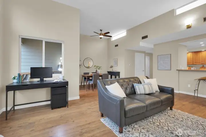 2 bed/2 bath gem with sweeping skyline views (including Cascade Mtns) from the east-facing premier top corner of coveted Knollwood! Open floor plan with 12’ ceilings & modern design. Updated Kitchen, floor, paint, doors, trim, list goes on. Open the slider to double your dining space! Carport, storage, lots & lots of guest parking, Seasonal pool & spa, no rental cap, pets ok, Lake Washington schools.
