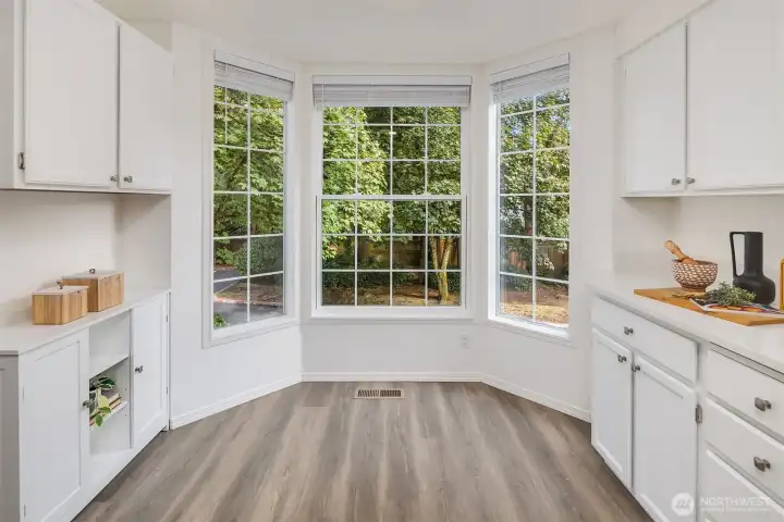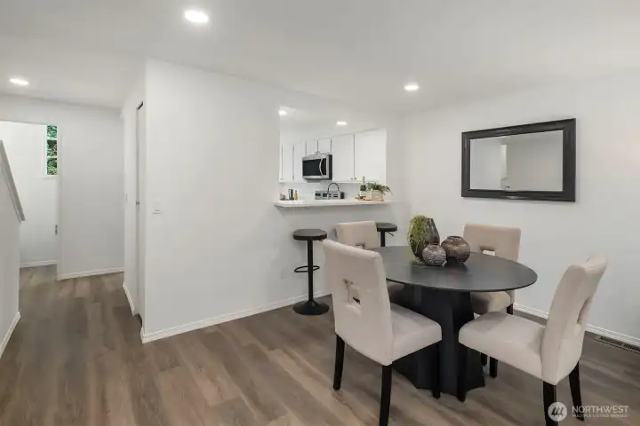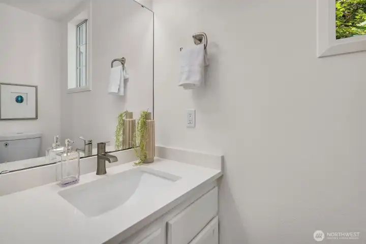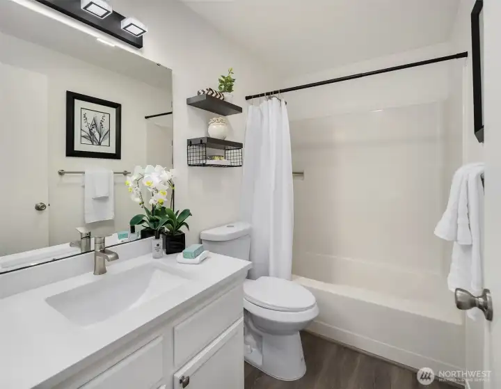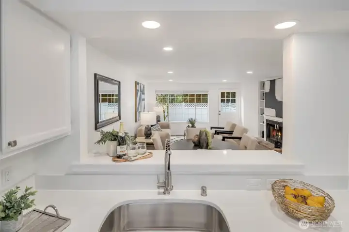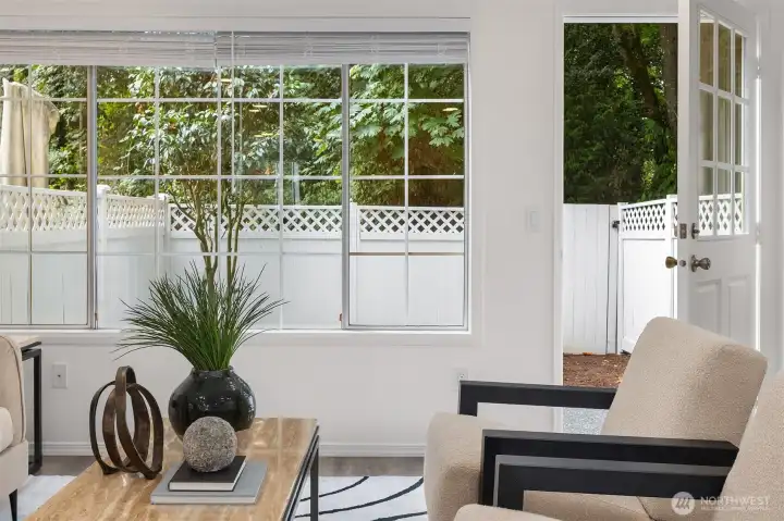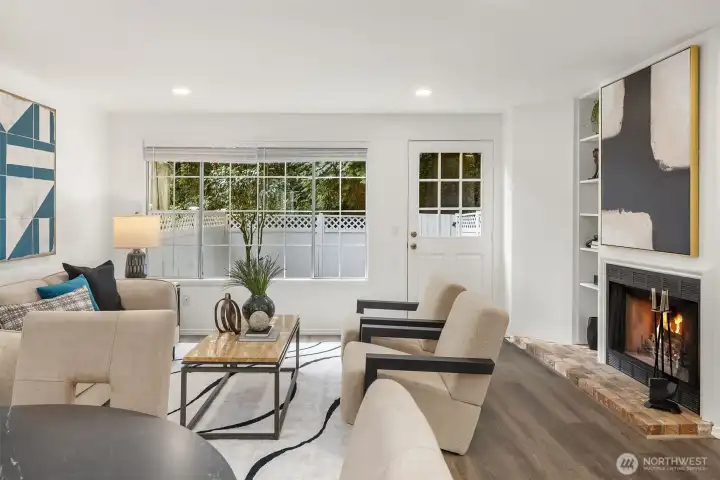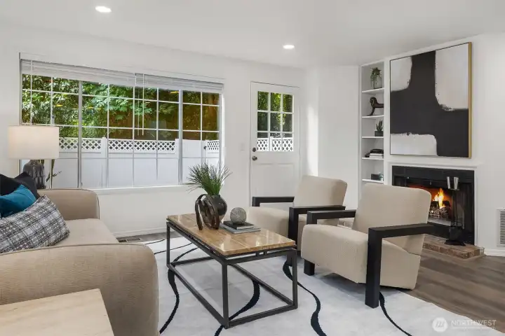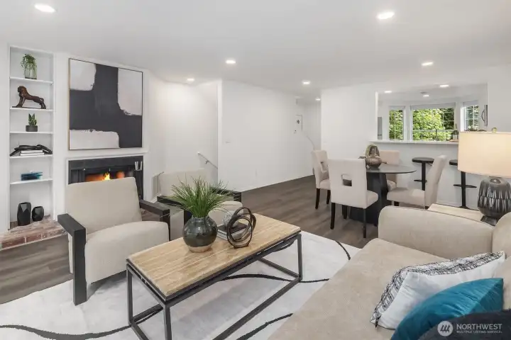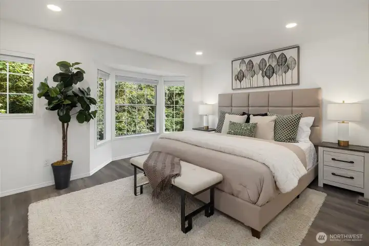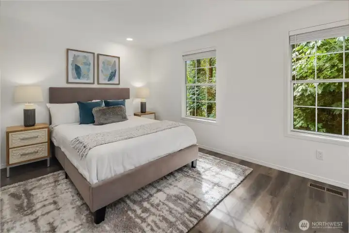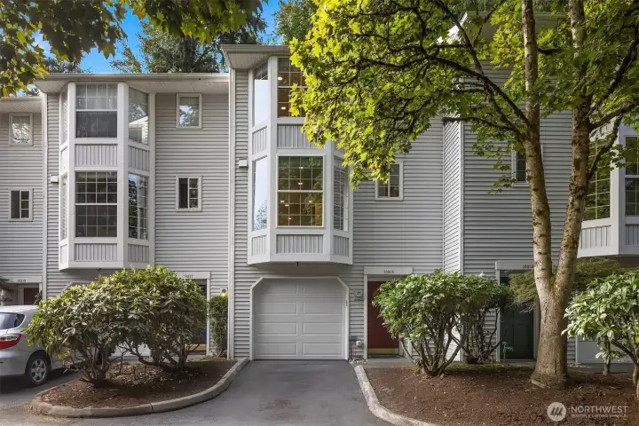 Tucked away on a private greenbelt in Juanita with scenic forest views from every window, this luxurious move-in ready gem boasts a dream dual ensuite layout, secluded fenced yard & spacious 2 car garage with driveway + 4th parking spot! Loaded with high-end modern upgrades: quartz counters, new appliances, custom lighting, EV charger, fresh paint, updated millwork & LVP floors throughout. Main floor features stunning kitchen with bay window nook & sweeping breakfast bar open to living & dining room with brick fireplace, built-in bookcase & oversized windows with french door to extended patio & garden. Upper bedroom suites with lavish full baths + powder room on main. Pre-inspected & pristine with low $125 dues, strong HOA & no rental cap!