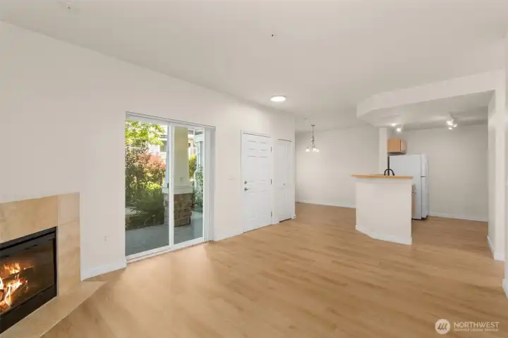 Corner end unit totally move-in ready with fresh paint and brand new LVT flooring throughout (no carpet)! Enter to living room with wonderful natural light, cozy fireplace w tile surround & slider to patio. Open design kitchen: wood cabinetry, new fridge, newer range & microwave. Fantastic layout w/two bedrooms including generous Primary Suite can fit a king sz bed, walk-in closet, it's own full bath: double sinks & oversized soaking tub. Head down the hall to the Guest Bedroom, new hallway bath w new custom walk-in glass shower w rainhead, & laundry in-unit. Popular Carrara at Lakeland, and easy one-level living. Detached garage parking. Community w/parks, Clubhouse. Enjoy an active Lakeland lifestyle!