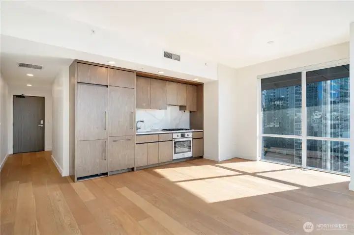The Emerald, Seattle's premier luxury high-rise building, in the heart of Pike Place Market and steps to Seattle’s revitalized Waterfront. This 2 bed 1 bath southwest facing residence features floor-to-ceiling windows with abundant sunlight, waterfront views & Mount Rainier view, spacious living room, White Oak hardwoods, custom cabinets, high-end Bosch appliances, a spacious spa-like bath, full-size washer/dryer, custom shades. Enjoy amenities including the rooftop lounge with panoramic views of Elliott Bay, Seattle skyline, 24hr concierge, fitness center, yoga studio, pet run, guest suite. 1 parking included!!