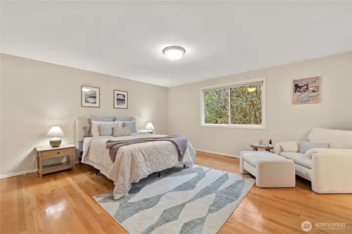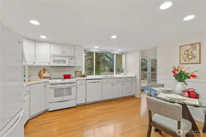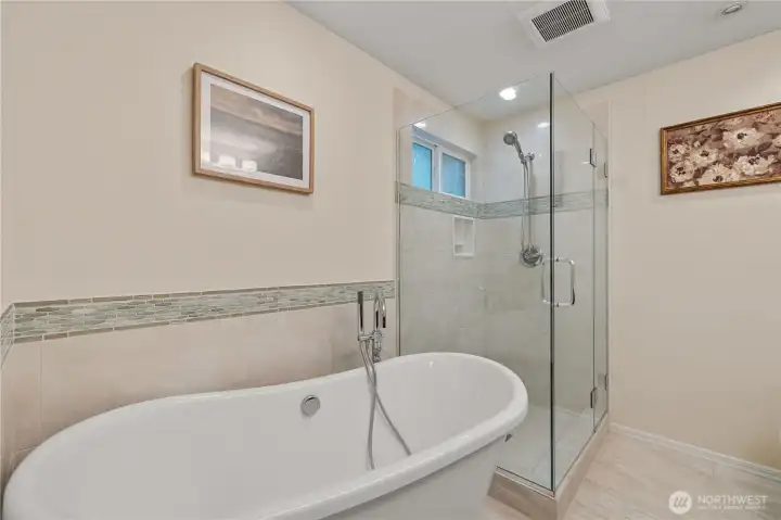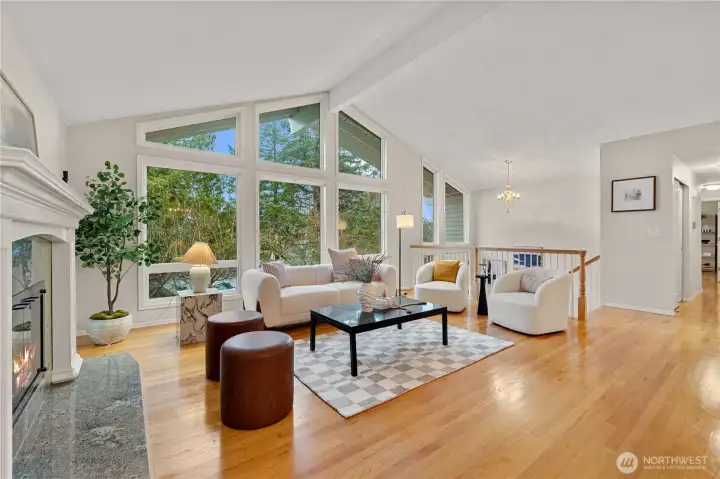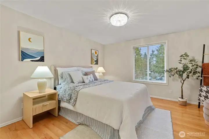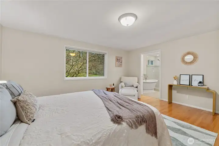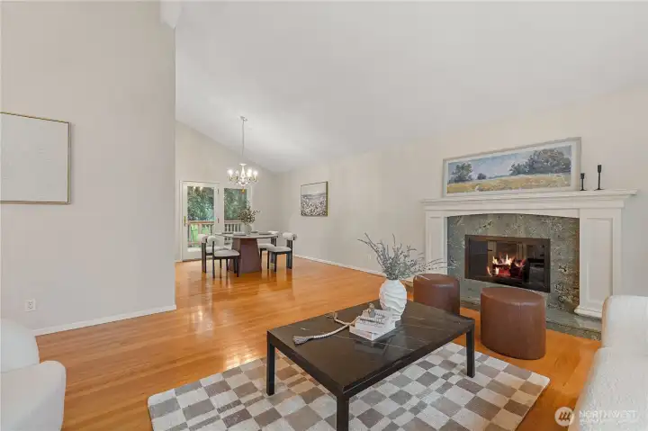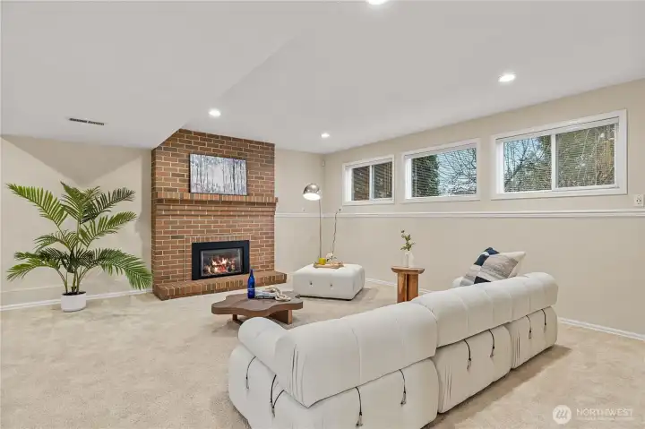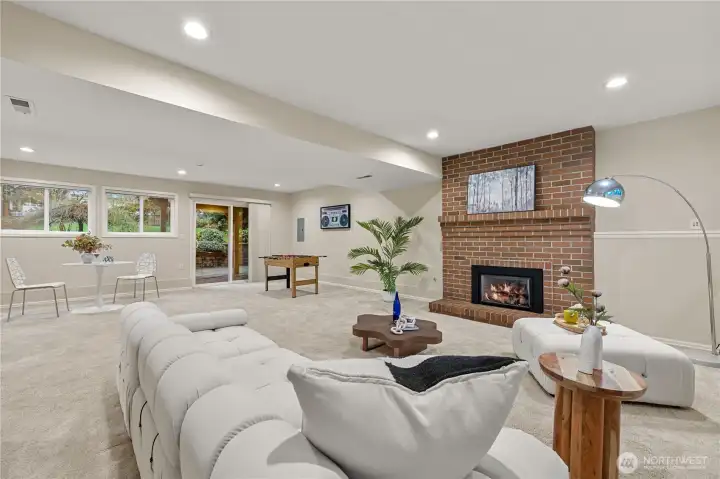 Moments from Microsoft’s main campus, this home features hardwood floors, vaulted ceilings, and two gas fireplaces. Kitchen and bathrooms update, and new roof were completed between 2019 & 2020. The private landscaped backyard includes a deck, large patio, and hot tub with privacy screen. Inside, enjoy a bright white kitchen with quartz counters, updated hall bath with a solar tube, and a spacious primary suite with a freestanding tub, frameless shower and dual vanity. Downstairs, you'll find a huge rec room with a gas fireplace, ¾ bath and laundry room. An extra-deep garage provides plenty of storage or workshop space. A/C will keep you cool in the summer.