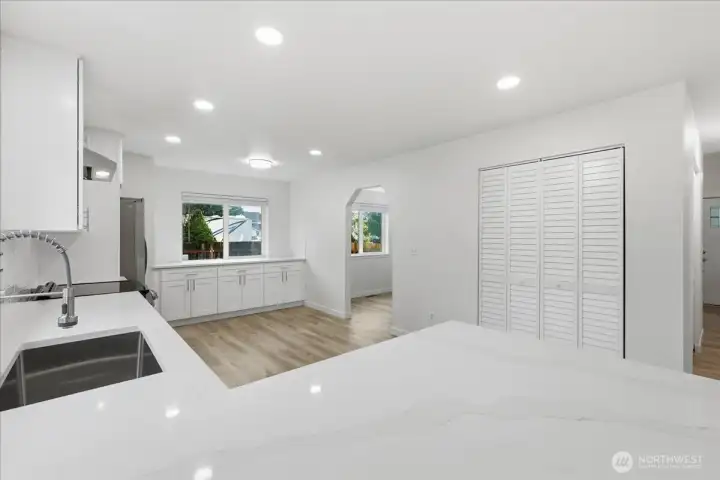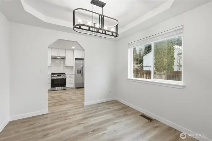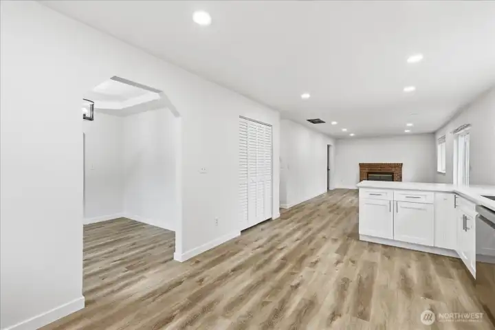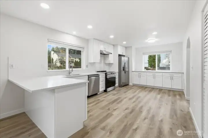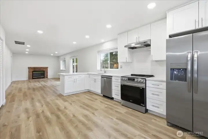 Updated Graham home with fully remodeled kitchen and bathrooms. Features new roof, fresh carpet, paint, millwork, doors, lighting, and hardware. Living room with fireplace opens to dining and modern kitchen with white shaker cabinets, tile backsplash, stainless appliances, and peninsula seating. Large primary suite with walk-in closet and updated bath. Three additional bedrooms plus full bath with tile surround. Fenced yard, patio, and two-car garage. Close to Meridian and amenities.