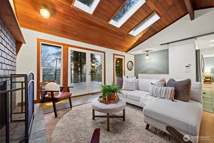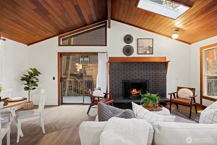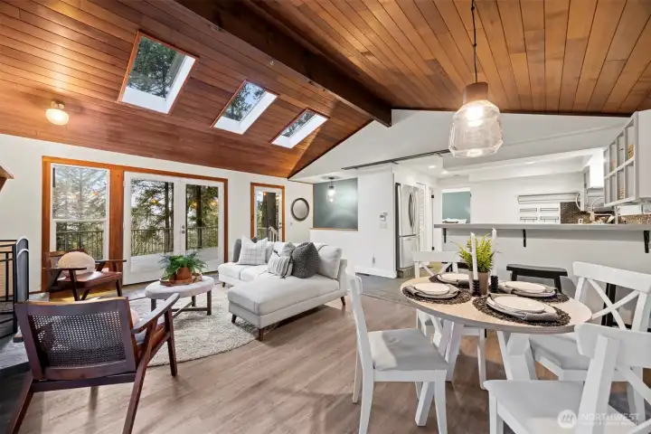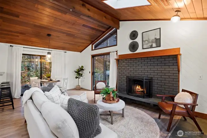 Bright, open spaces & multiple outdoor living areas make this home easy to love. Vaulted tongue + groove ceilings, skylights & French doors open to a west-facing deck that feels like an extension of the living room. Kitchen offers ample counter space, SS appliances, generous storage & an easy flow to the dining area w/sliders leading to a 2nd deck. Large primary fts spacious dressing area w/2 closets & access to main level bath. Lower level fts rec room w/fireplace, 2 bedrooms & 2nd full + remodeled bath w/laundry room. Low-maintenance yard keeps summer simple & spacious workshop gives you room for projects, storage, or hobby space. New furnace/heat pump + H2O heater! Close proximity to golf course, lake access, parks, pool, trails + more!
