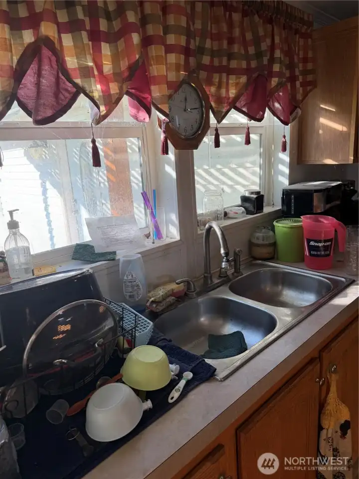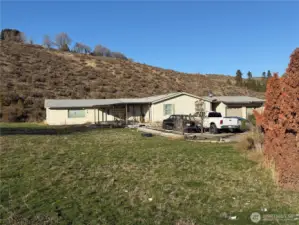 Large views of the mountains from your home on 2.93 acres and close to the town of Okanogan. 2006 Manufactured home with additional grand room 720 sq ft to enjoy sharing space inside with the various seasons of the year. Home has nice set back from the highway and an additional small mobile home on the property. Red barn has an upstairs area too. the home has an attached garage and a patio deck and a fenced yard area. Three bedrooms are on the opposite side of the primary bedroom. Kitchen has an eating area, and the home has space for cars to park. Very easy to make use of the full property with water rights to irrigate.