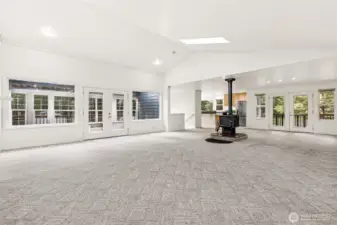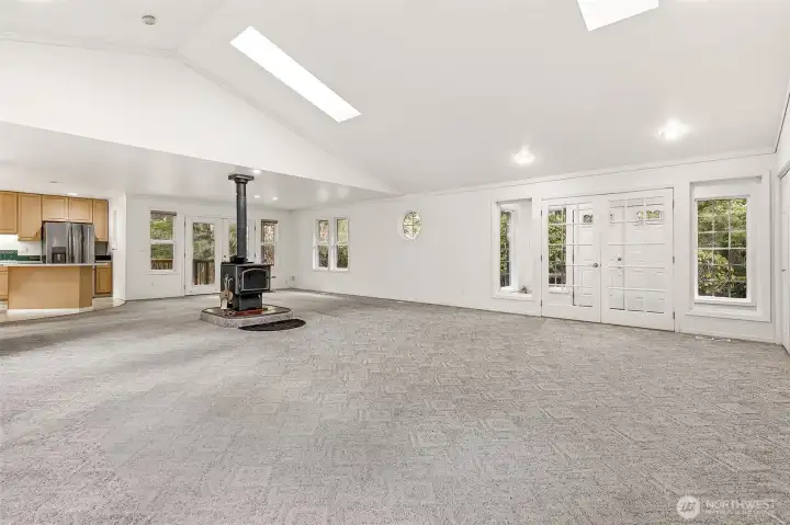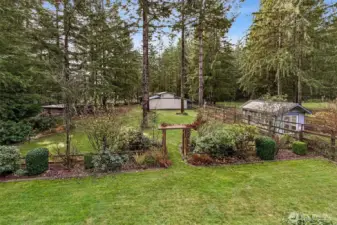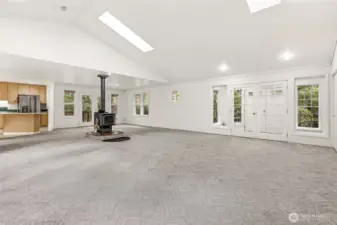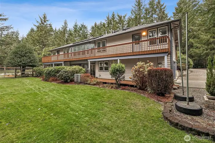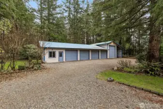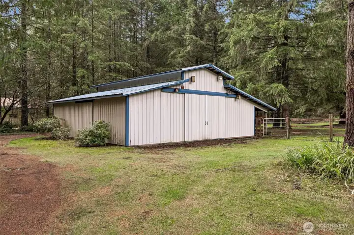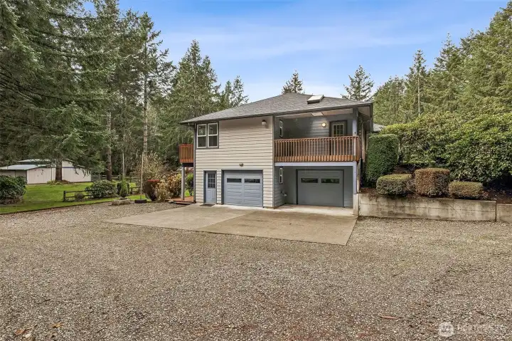 All-in-one package deal! Enjoy a main-level primary bedroom with an attached 2-car garage, plus a 2,280 sq ft shop, 1,296 sq ft barn with tack room and 3 stalls, and a garden shed—all on a flat, usable 5 acres. A second primary suite on the lower level offers separate entrances. Vaulted ceilings, open-concept living, a free-standing wood stove, kitchen with island & 2 large pantries, and 13 skylights fill the home with natural light. Enjoy the large wrap-around deck. The attached garage and shop have 220V service. Covered RV parking and beautiful landscaping create a private, parklike retreat close to Tumwater schools, shopping, and commuter routes.