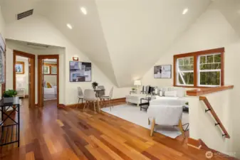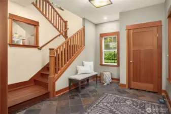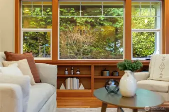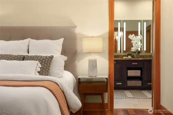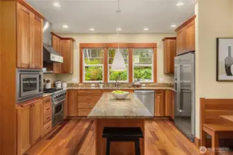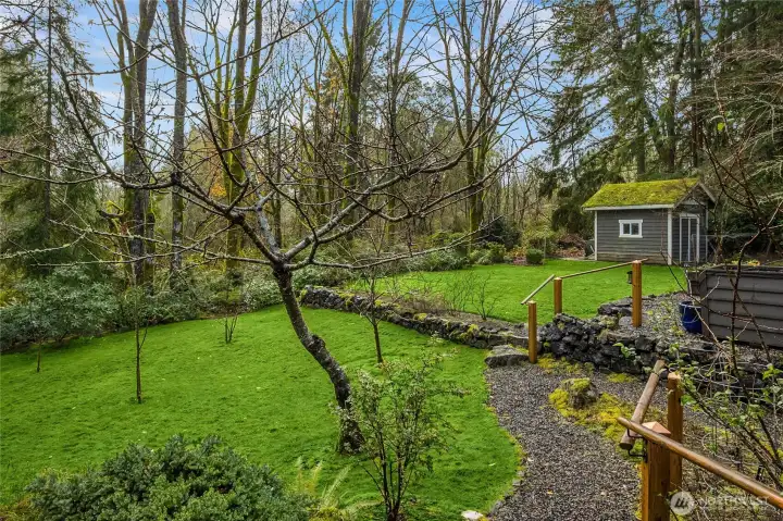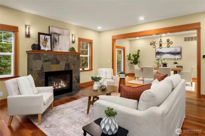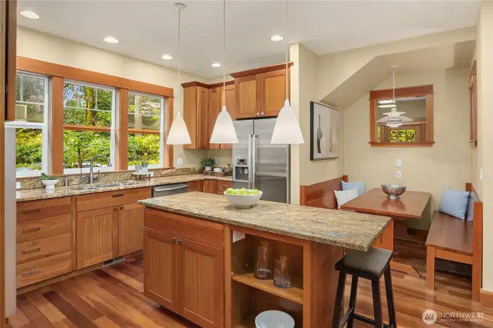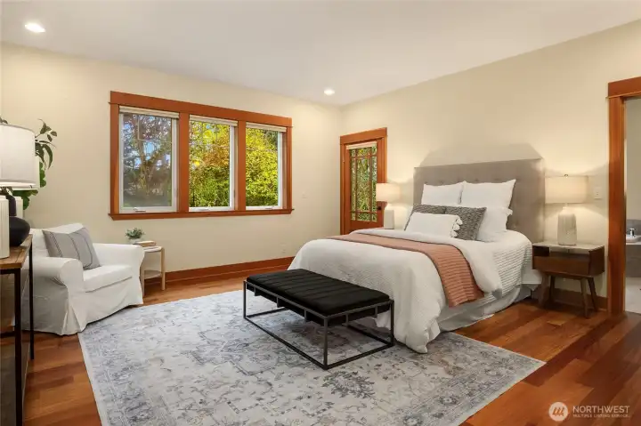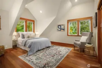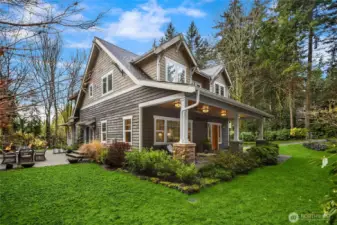 Gorgeous private Craftsman-style home with sophisticated finishes on a lovely lot in Rolling Bay. Relax on the large front porch while overlooking the gardens & then step into the open-concept main floor, perfect for entertaining, with a cook’s kitchen featuring top-end appliances, plenty of storage, & a charming breakfast nook, a first floor primary suite with its own sweet private porch; plus 3 bedrooms, an office, & a large family room on the second floor. Both floors have lovely hardwood floors throughout. In addition, there is a large patio w/ a stone fire pit to gather around, & a covered passageway leads to the detached garage w/ a guest suite or office w/ a 3/4 bath above (additional 460 sq ft not included in listed square footage).