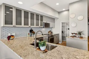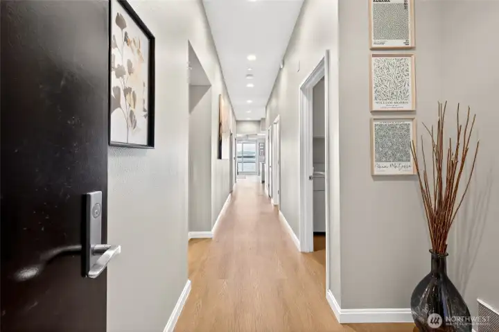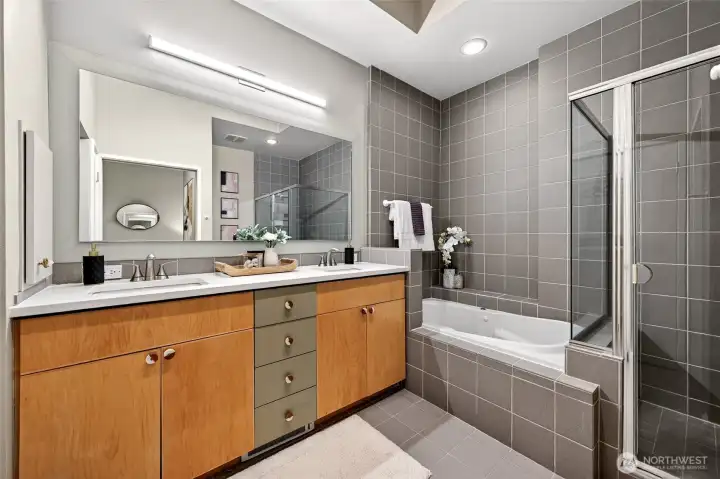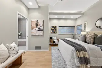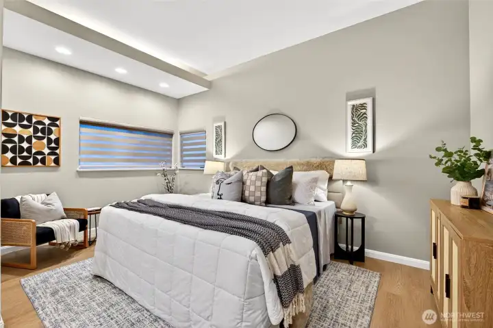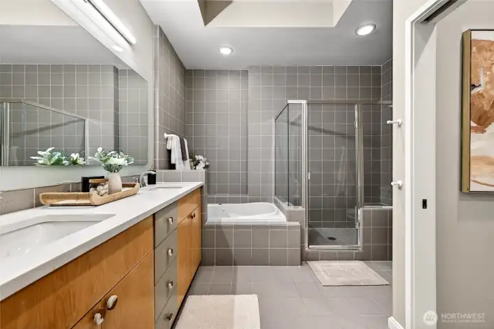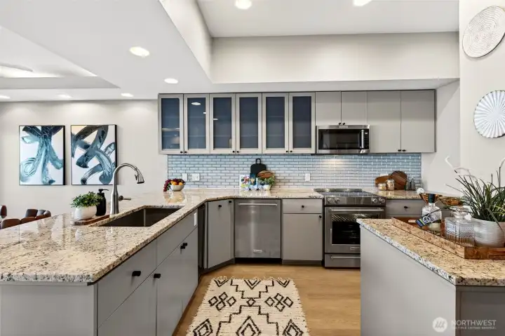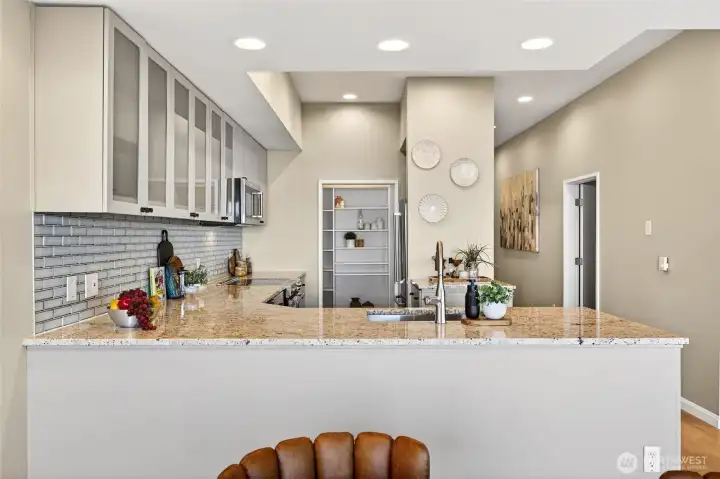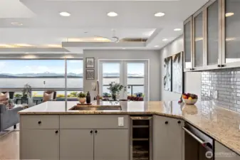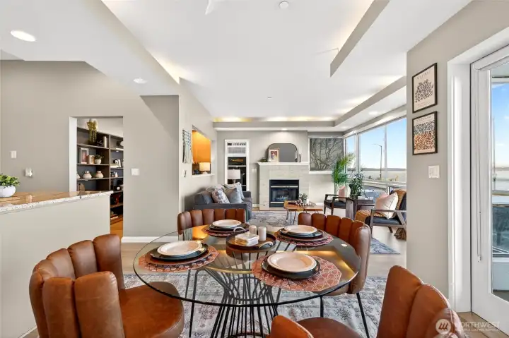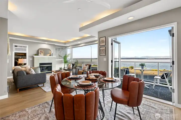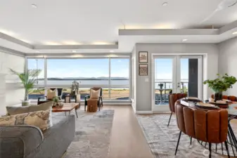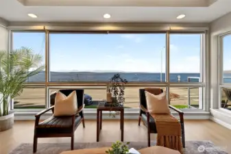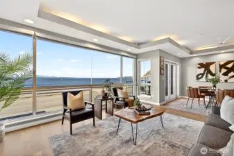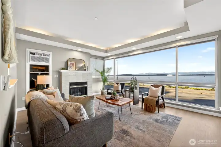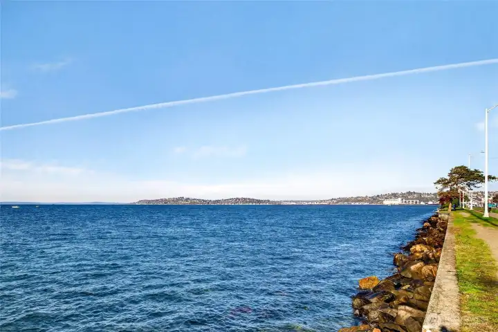 Welcome to this Beautiful 2 bed + office, 2 bath w/Floor-to-ceiling windows. Unobstructed views from the living, dining, kitchen & office of the Sound & Mountains. Enjoy watching ferries, whales, & beautiful sunsets w/no wires or buildings in sight. This home has high ceilings, open layout ideal for everyday living and entertaining. The remodeled kitchen has generous cabinetry, newer appliances, a spacious pantry, complemented by new floors, fresh interior paint, & updated bathrooms. In-unit A/C for comfort. The primary suite is designed for relaxation. A rare large laundry room w/storage. Storage, 2 sec parking spots, EV ready, & a well-managed HOA. Just steps to Alki Beach, dining, coffee shops, the water taxi. This is a true must see!