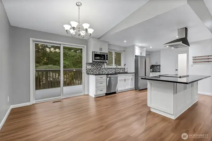 Looking into kitchen and dining space from family room.