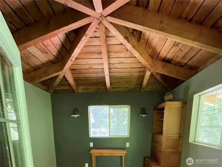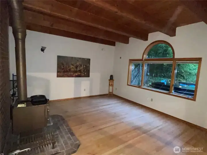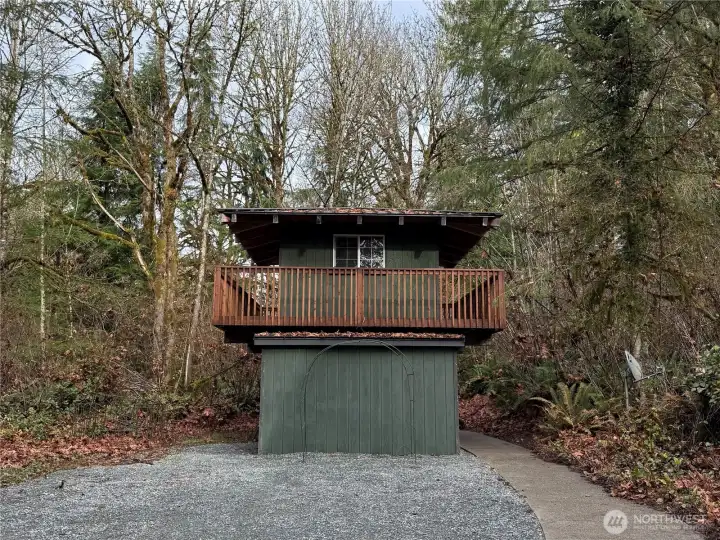 Priced to sell! Welcome to this private, unique home on 5.62 wooded acres with a 2-car attached garage. Open layout with 3 bedrooms, including 2 generous master suites, and a sunken living room with a cozy wood-burning stove. First-floor hardwoods are refinished, and fresh neutral paint throughout. The serene exterior boasts a spacious brick patio, large deck with a former hot tub spot, and an oversized carport for an RV. The special outbuilding offers two storage rooms below and a beautiful vaulted-ceiling second-story room—perfect for a home office. Seller offering 1.5% concessions to prospective buyers.