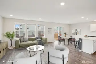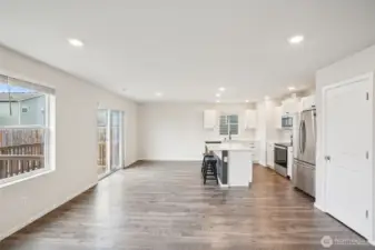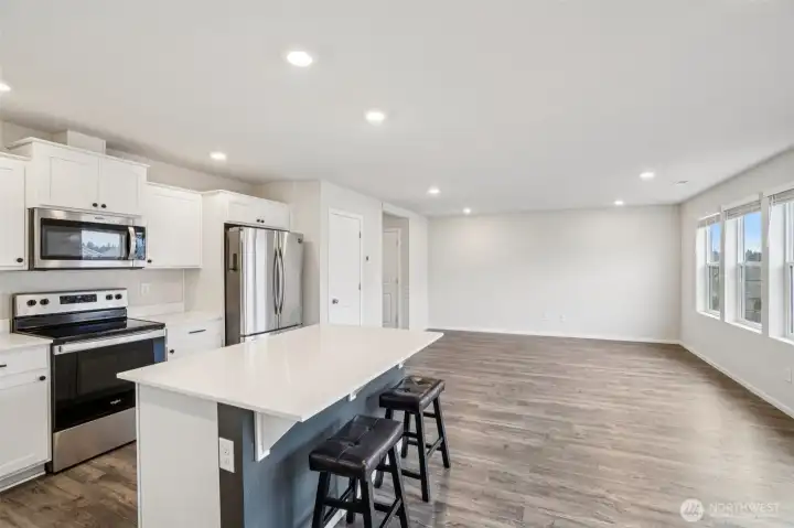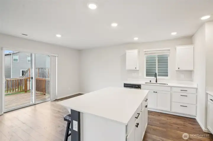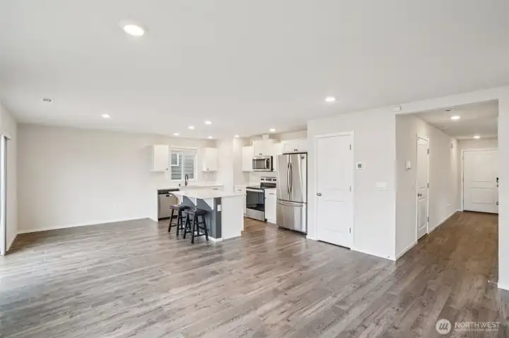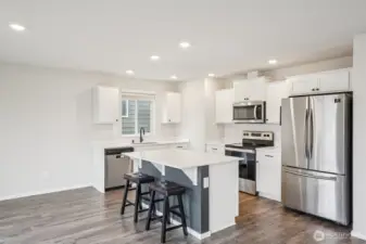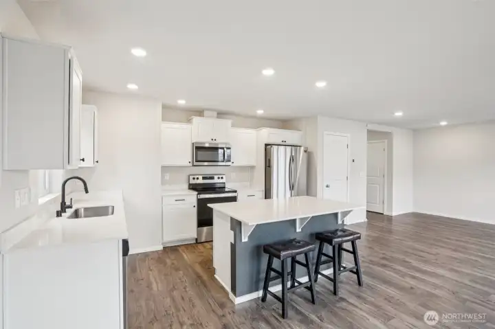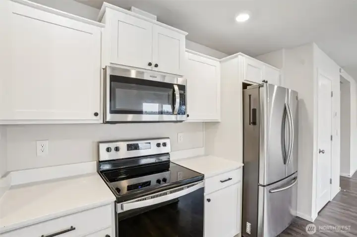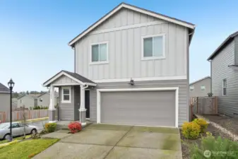 Welcoming covered front porch with keyless entry leads into a bright great-room connecting the family room, dining area, and island kitchen. Family room with recessed lighting, while the kitchen features stainless Whirlpool appliances, a Samsung refrigerator, quartz counters, lots of cabinetry, walk-in pantry, and an island/eat bar. Slider from dining area opens to the back deck. Upstairs, primary en-suite offers a walk-in closet, and quartz vanity and shower. 3 additional bedrooms, full bath, laundry room with Samsung washer and dryer complete the upper level. Main-level powder room adds convenience. Home includes mixed flooring throughout, a 2-car garage, and fully landscaped corner lot with sprinklers. Mortgage savings may be available.