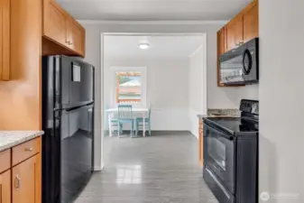 Charming updated rambler with finished basement! The main level features stylish laminate plank flooring, a modern kitchen with slab granite countertops, soft-close cabinetry, and a dedicated dining area. Two bedrooms and a full guest bath complete the upper floor. Custom built-ins add functionality off the kitchen and basement landing. The lower level offers flexible living with a spacious bonus room, den/office, additional bedroom, half bath, and laundry area. Step outside to a mostly fenced backyard with a covered deck, patio, and outbuilding—perfect for entertaining or relaxing. Possible alley access for parking via the side gate. Conveniently located just minutes from downtown Auburn, shopping, dining, and quick freeway access to HWY