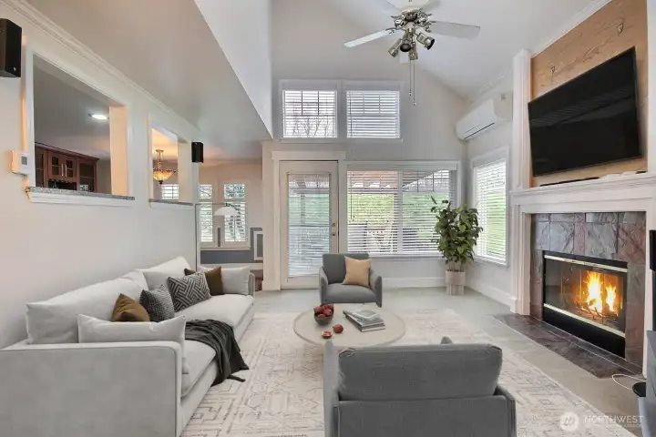 Upgraded end-unit townhome w/ slate-tile entry, stained-glass chandeliers, L Rm w/ vaulted ceilings, FP + Mini-split AC, chef-inspired kitchen w/ hardwood floors, solid wood cabinets, granite countertops, stainless appliances, & breakfast nook w/ beverage fridge. Enjoy the Patio w/ Pergola & gas fire pit. Upper Primary BRm walk-in closet, spa-like BA w/ heated floors. 2+ BRm & full BA. The 1/2 BA, in-unit laundry, & access to a 2-car garage w/ built-in storage. Community playground w/ exercise stations, BB court, 19mi biking & walking trails, BB fields, Golf, ice rink, & Meeker Urban Village. Commuting w/ nearby bus stop, Sounder &Light Rail trains OPEN!. Schedule a tour today to see this convenient, comfortable, living, active community.