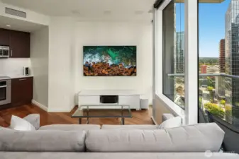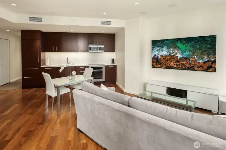 Live in the heart of downtown Bellevue in this sunny south-facing 1BR at Bellevue Towers. Highlights of this tastefully updated home include custom foyer built-ins, updated kitchen w/ Miele appliances, commercial-style stainless sink & new quartz countertops, upgraded lighting, built-in speakers, and newer HVAC, plus a light and open floor plan w/ 9’ ceilings and a sliding door system at the bedroom offering privacy when you want it. The conveniently located, large parking space features EV charging on a custom pulley system for ease of use. Bellevue Towers offers fitness rms, whirlpool spa, dining rm w/ kitchen, community rm theater, outdoor terraces, concierge and all the best of downtown: walk to shopping, dining, downtown park and more.