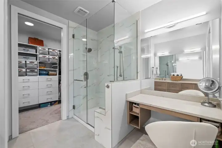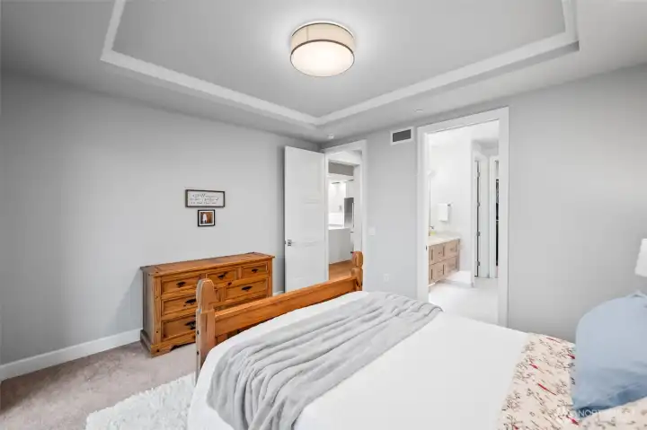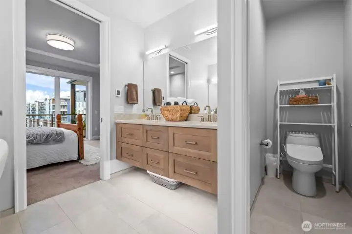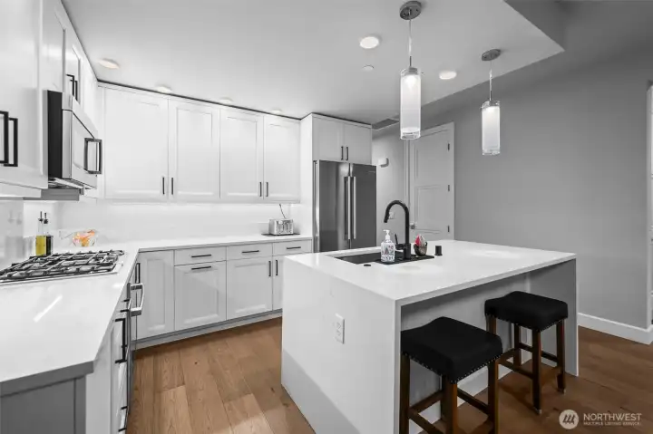 Experience the Point Ruston lifestyle from this exceptional condo in the coveted Rainier Building. Featuring an open layout w/ 9' coffered ceilings, wide-plank flooring, motorized blinds, living room w/ cozy fireplace flowing seamlessly into chefs kitchen w/ white cabinets, SS Bosch appliances, quartz counters & separate dining- perfect space to entertain. Serene primary suite w/ walk-in closet, spa-quality bath w/ heated tile floors. Laundry w/ sink- w&d included. TWO covered decks to relax from showcasing city lights, cascades & sunsets. Includes 2 reserved parking spaces (1 is EV) & a storage unit. Enjoy unmatched accessibility to shopping, dining, entertainment, trails, bike/kayak storage & more! LID is paid. Tax abatement through 2030.