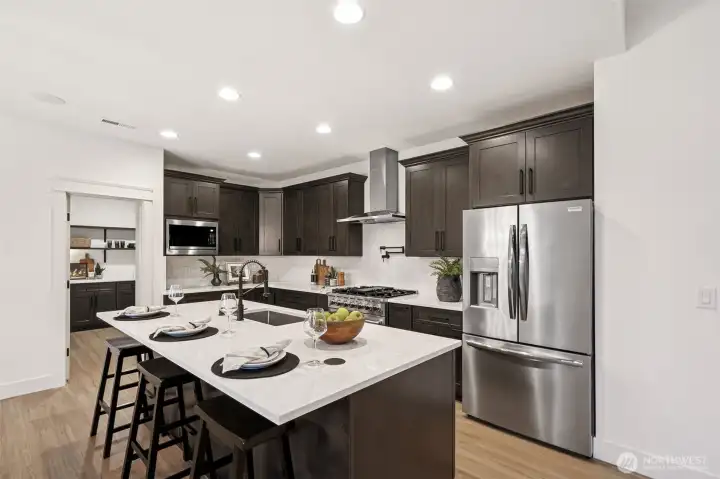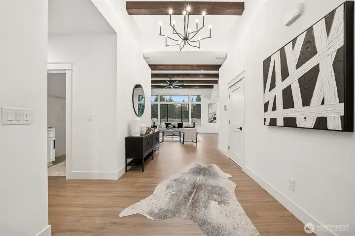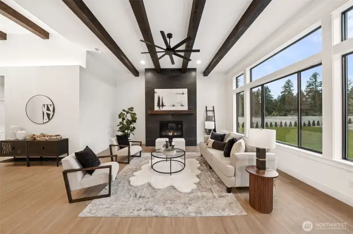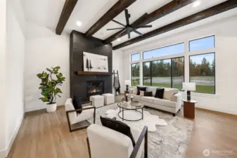 Exceptional new construction home featuring high-end finishes throughout. Step into a bright living room W/vaulted ceilings & stunning custom fireplace wrapped in floor-to-ceiling tile. The gourmet kitchen boasts quartz countertops, a solid full quartz backsplash, 36" Forno range, Frigidaire appliance package, & convenient pot filler. Interior wood-wrapped windows add warmth & craftsmanship, while the luxurious primary suite offers a relaxing spa-inspired bath W/quartz counters, a soaking tub, & beautifully tiled shower. 3 additional bedrooms & full guest bath. RV garage W/14' ceilings, Electric Car charger, & workspace/storage. Fully landscaped front/back + extended back patio complete W/a BBQ stub—ideal for entertaining year-round.