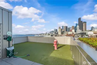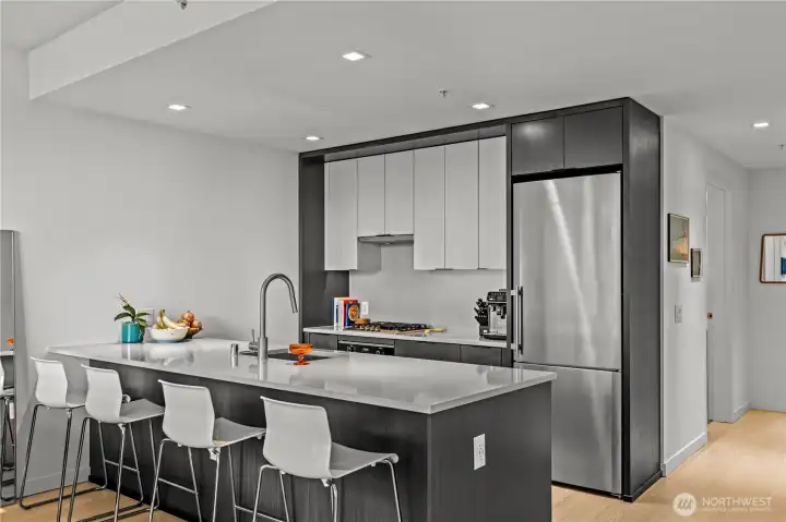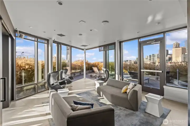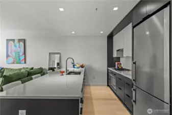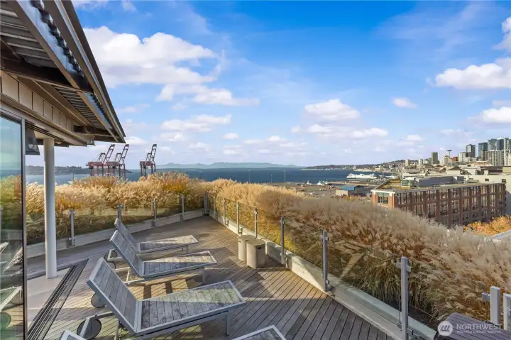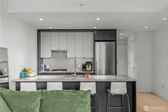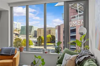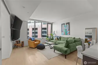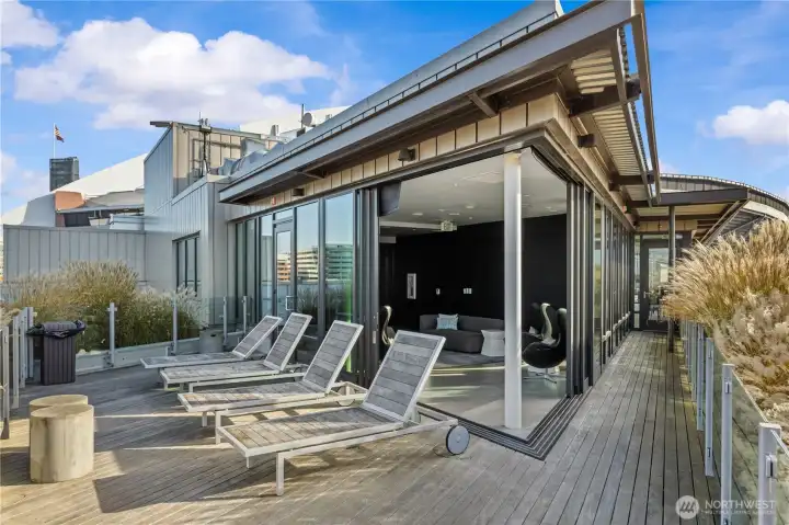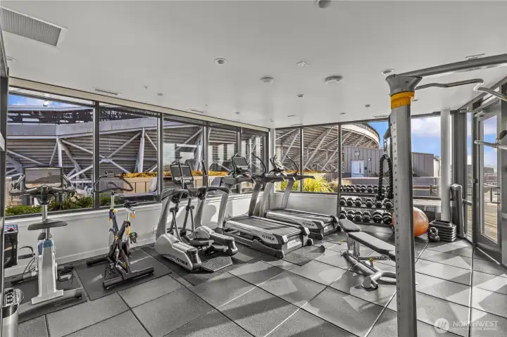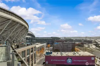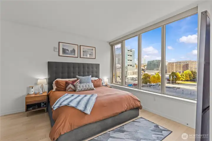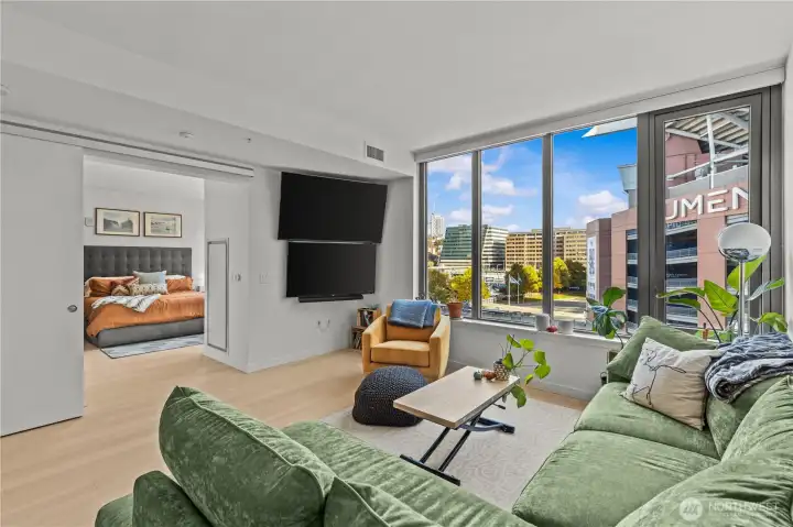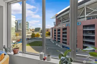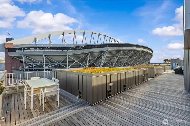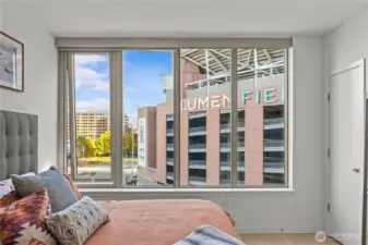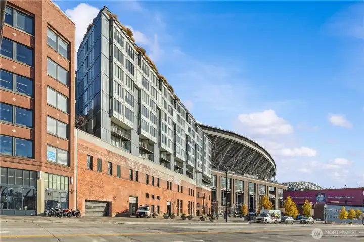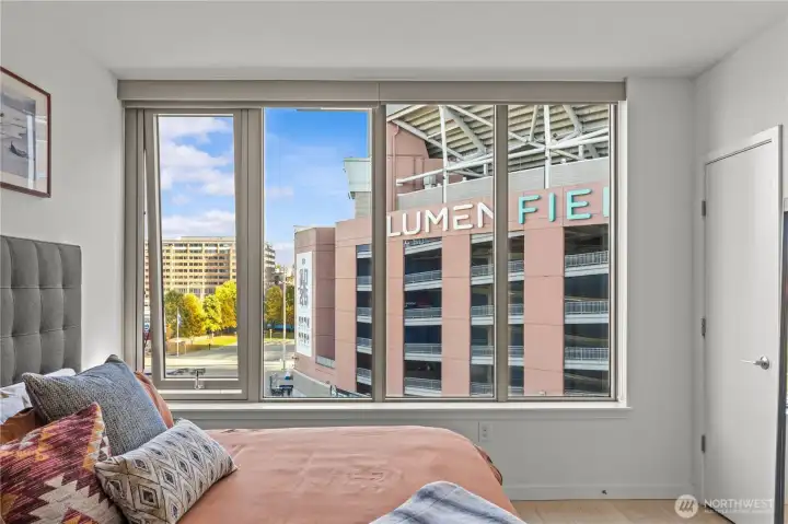 Welcome to the Gridiron Building in Seattle's vibrant Stadium District! Modern open-concept living with soaring vaulted ceilings, quartz counters, stainless appliances & sleek finishes throughout. Oversized bedroom easily fits king bed + home office, huge walk-in closet. Spacious bathroom with full sized washer and dryer. Roll down shades and A/C. Resort-style amenities: rooftop deck w/ party kitchen, grills, wine lockers & epic views, plus 24hr fitness center. Pet area and pet wash. 93 Walk Score! Steps to Pioneer Square, light rail, stadiums, waterfront, restaurants & transit. Secured parking + extra storage included.