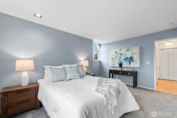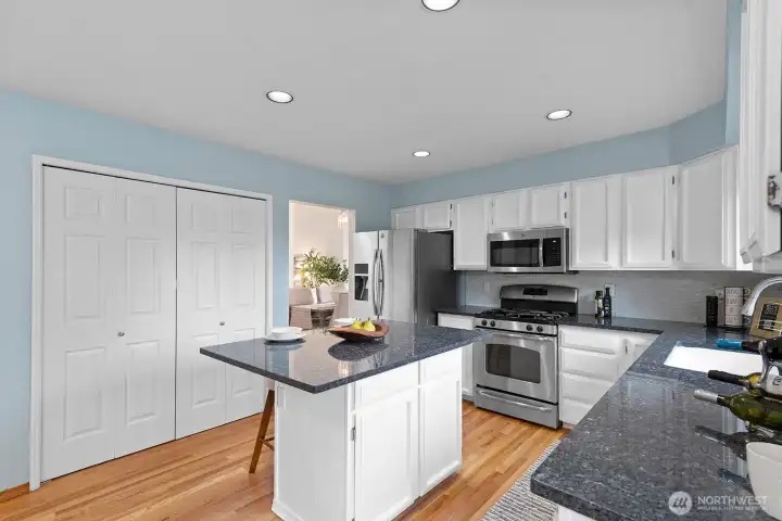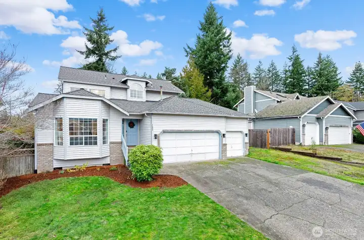 Beautiful home in a peaceful setting with 3 bedrooms and 2.5 bathrooms upstairs, and all the living spaces on the main level. A circular floor plan and a dramatic open staircase to the upstairs. Just refinished hardwood floors throughout the main level, a vaulted ceiling and a bay window in the living room. The chef's kitchen includes an island, stainless steel appliances, a gas stove, and granite counters. The kitchen is adjacent to the family room, and overlooks the level rear yard. A spacious primary suite with a walk-in closet, soaking tub, and separate shower. Three-car garage! Non-thru street so very little traffic. Excellent Kent location.
