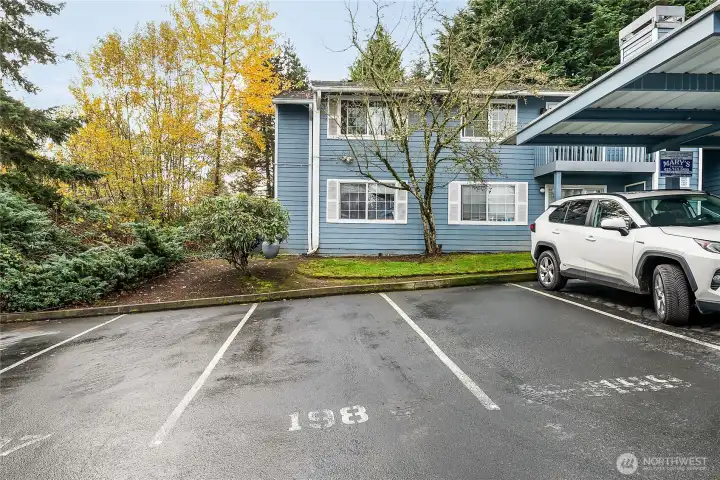 Welcome to this move-in-ready 2-bed, 2-bath second- floor corner unit in desirable Martha's Landing. Enjoy brand-new vinyl plank flooring, a cozy wood-burning fireplace, and a private balcony with additional storage surrounded by evergreens. Kitchen offers ample storage and convenient-in unit laundry. Community amenities include an indoor pool, hot tub, sauna, fitness room, and a kids' play area. Prime location near Mill Creek Town Center, Alderwood mall, and I-5 access. One designated parking spot available with ample guest parking, pet-friendly, and no rental cap!