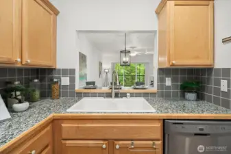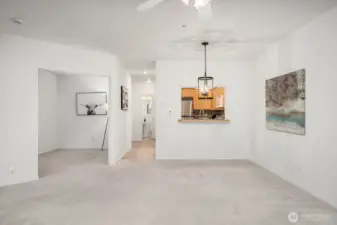 Effortless comfort awaits in this bright 1-bedroom + den, 1.75-bath condo within walking distance of The Village at Totem Lake. Sunlight fills the open living area and extends to a private deck, perfect for relaxing or entertaining. The kitchen features maple cabinetry, tiled entry, and ample storage. A spacious den offers flexibility for a home office, guest room, or reading nook. The primary suite includes dual closets and an ensuite bath. Enjoy everyday ease with 2 dedicated covered parking stalls, private storage, elevator access, and a heated driveway, all in a prime location near shopping, dining, and entertainment. No rental cap!