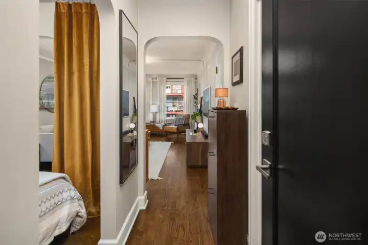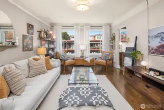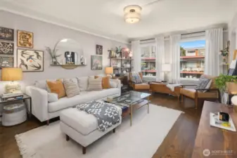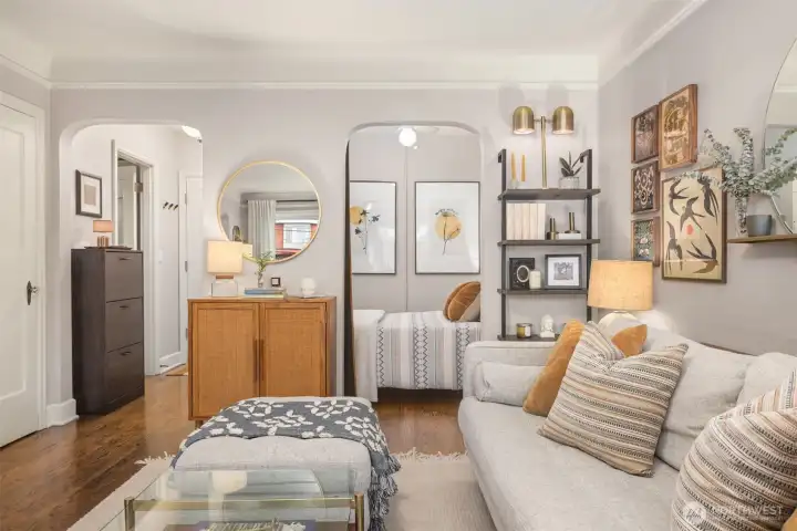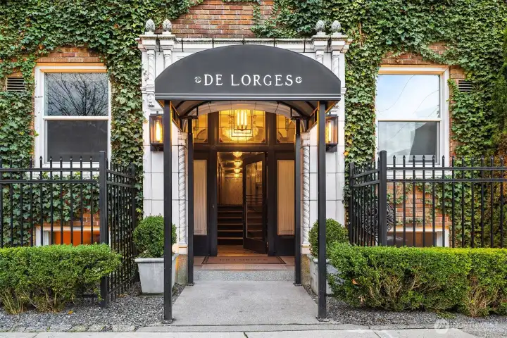 Ever so gorgeous, discover the De Lorges ~ In the heart of Broadway on Capitol Hill, this alluring 1928 art deco showpiece dazzles with intricate limestone details, elegant period lighting & charming ivy accents. Fully renovated in 2008, the building exudes vintage charm & historical integrity while enjoying the comforts & longevity of modern system upgrades. Grand lobby & exquisite halls complete with a Bostwick gated elevator. Brilliant open bedroom layout lives large with timeless style. Coved ceilings, arched doorways, lofty windows, rich hardwoods, ornate millwork, antique hardware & full bath with original hex tile floor. Granite & shaker kitchen with glass tile backsplash, gas range, dining nook & laundry closet + bonus storage room!