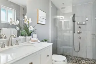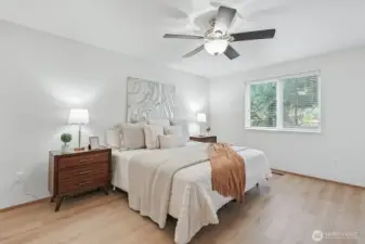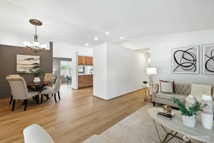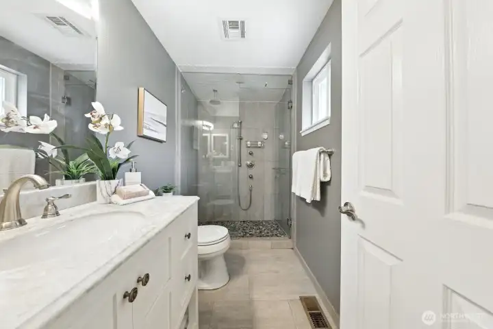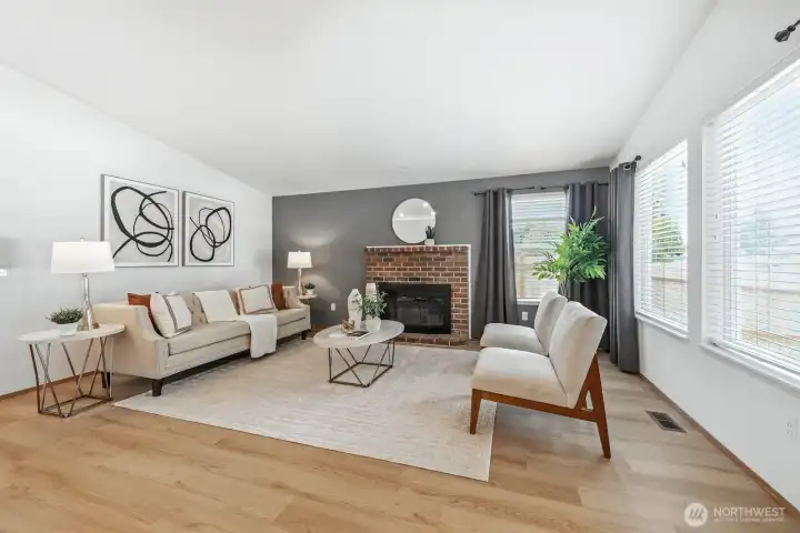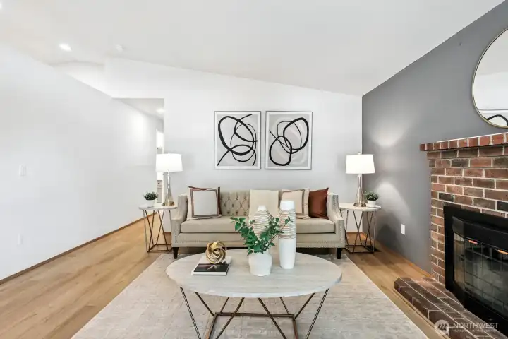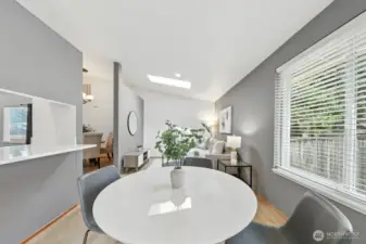 Beautifully cared-for rambler in an ideal spot close to shopping, restaurants, and transit. Both the living and family rooms feature vaulted ceilings—one highlighted by a skylight, the other warmed by a wood-burning fireplace. A formal dining area and bright breakfast nook connect seamlessly with the kitchen, making the space perfect for daily comfort and hosting guests. The renovated primary bath includes heated floors, a marble vanity, and a luxurious steam shower. Outside, a spacious fenced yard offers a patio and fruit trees for relaxing or entertaining. Recent improvements include updated flooring, a new water heater and exterior paint. Gas furnace and oversized 2-car garage. Popcorn ceilings? None here. Move-in ready with no HOA.