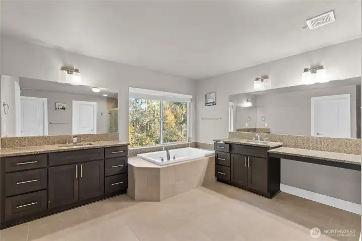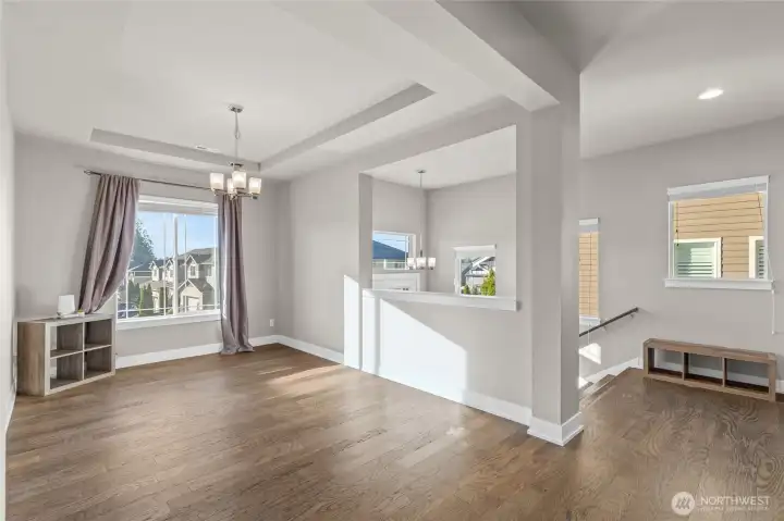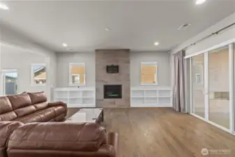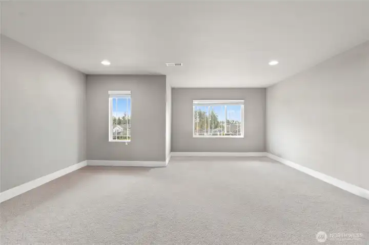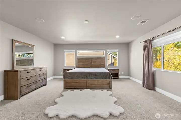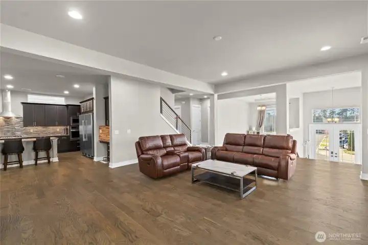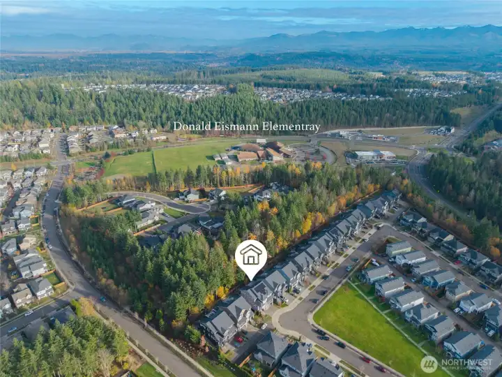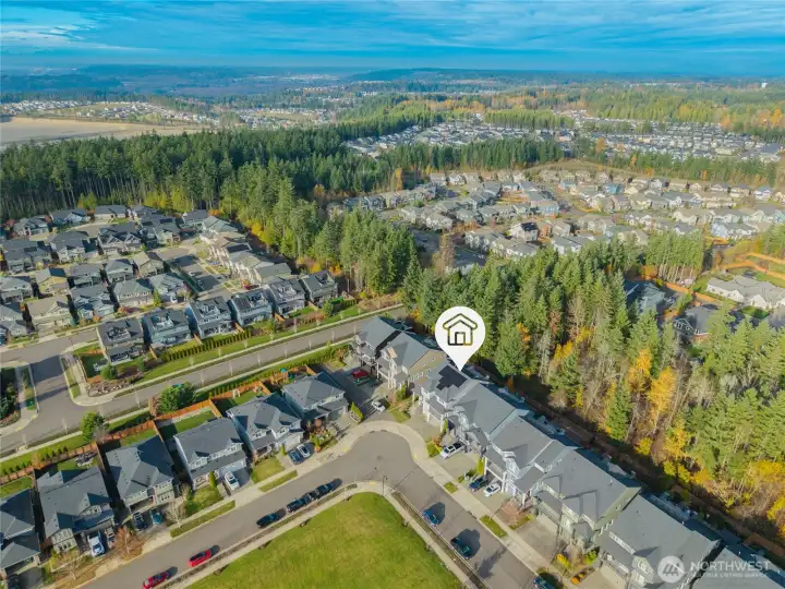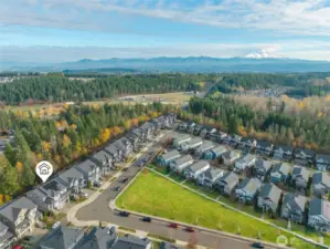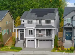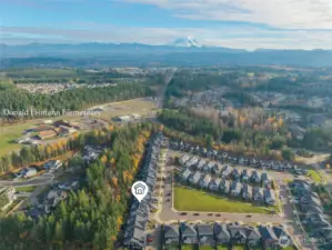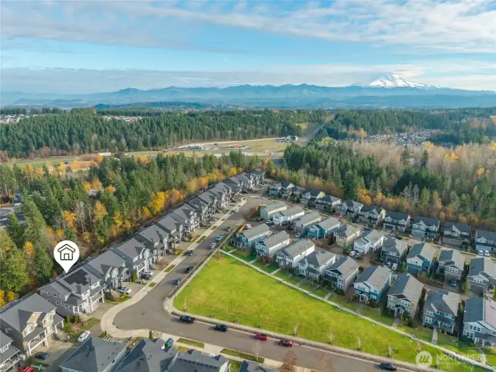 Enjoy year-round Mt. Rainier views from this Tehaleh home with a 3-car garage, A/C, and solar panels. Ideally across from a park and backing to a greenbelt, the community offers 40+ miles of trails, 10+ parks, expanding dining, retail, schools, and a mountain-bike park. Inside, hardwood floors lead to a chef’s kitchen with stainless steel appliances, oversized island, and built-in speakers. A main-level den/bedroom with a balcony adds flexible space. Upstairs, the primary suite has a spa-like 5-piece bath and dual walk-in closets, plus an oversized family room. The great room opens to covered outdoor living with fireplace, expanded patio, hot tub, and fenced yard with trail access. A rooftop deck with gas firepit captures Mt. Rainier views.