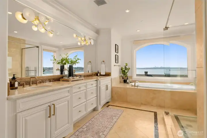 Imagined and executed by famed Street of Dreams® Builder, Fahim Construction, this refreshed manse welcomes you home with timeless and graceful ambience, elevated vision and views of everything! Mt. Rainer, Bellevue skyline, Seattle Skyline, The Space Needle fireworks, the Olympic Mountains and Lake Washington are all included in your life. The highest quality features & attachments, solid & intricately crafted woodwork and mentionable appliances. A great room representing strong features flows effortlessly from gourmet kitchen to open living space and continuing out on to the sunset viewing deck. Brazilian hardwood floors, arched doorways, triple crown moldings, bold columns, built-ins and stately fireplaces make for impressive spaces to entertain or to just enjoy. Cool afternoons and al fresco dining on the patio or warm evenings watching the sun set on the horizon. Kitchen has wet bar with wine cooler, built-in espresso machine, double oven, newer frig and 8 burner VIKING range, zonal HVAC system, designer upgrades to paint, hardware, and lighting. Enjoy the game in spacious family room w full wet bar. Primary 5 piece suite & 2 en suites up. Visiting friends & relations will enjoy their private space in the 1 bedroom apt. over 3 car garage & alley access. Walk in storage & pantry. MASSIVE walk THROUGH closet in privary suite! So big it has 2 doors. This home is within walking distance to Waverly Park, downtown Kirkland restaurants & shops & Sur le Table!