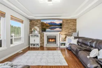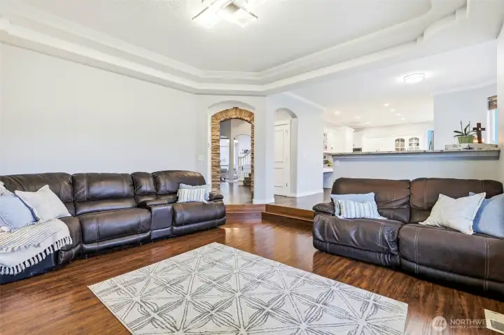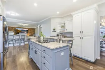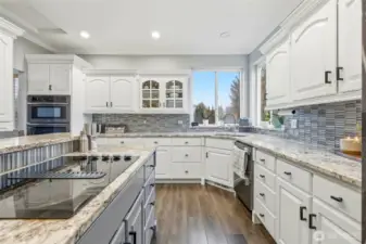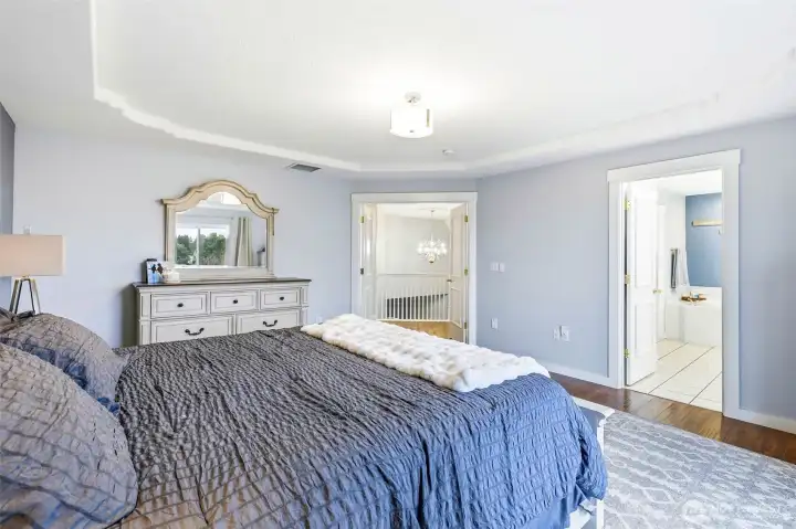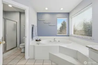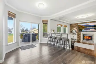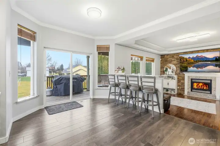 corner lot home, partially fenced, heated pool, sunset-view patio, and lush landscaping. Family room with fireplace, chef-ready granite kitchen island and breakfast nook. Main-level office/den (can convert to guest suite with nearby ¾ bath). Primary suite with jetted tub, walk-in closet, and private balcony. Four additional bedrooms, coffered ceilings, skylight. Finished workshop with mechanic’s pit and HVAC. Casa de esquina con amplio terreno, piscina climatizada y cercada. Sala familiar con chimenea, cocina con encimeras de granito y desayunador. Oficina/estudio (posible suite de invitados con baño cercano). Suite principal con tina de hidromasaje, vestidor y balcón privado. tragaluz. Taller terminado con foso mecánico y HVAC.