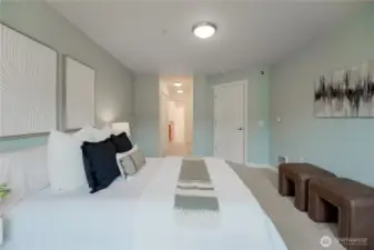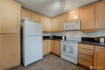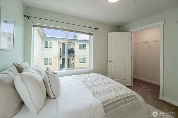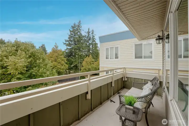 Top-floor, end-unit condo lives large with abundant natural light and west-facing windows that fill the space with warmth. The open kitchen with extensive cabinetry flows into a spacious living and dining area and a private deck for fresh air and relaxation. Featuring 2 bedrooms and 1.75 baths, the primary suite offers three closets and an en-suite; the second bedroom includes a walk-in closet. In-unit washer/dryer, elevator access with no stairs, and two secure parking spaces add everyday ease. Pet-friendly, well-managed building with strong reserves and no rental cap. Near groceries, parks, dining, I-5, and the future Pinehurst Light Rail Station (2026).