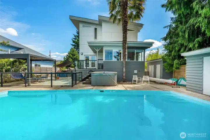 This extraordinary property offers the ultimate blend of luxury, style & multigenerational living. Every detail was crafted w/ elegance & function - from the Thermador range to the custom, world-renowned John Boos countertop. Host unforgettable gatherings in the heated saltwater pool, hot tub, or under the charming gazebo. The newly constructed top floor hosts 3 bdrms plus a showstopping primary suite.The spa-inspired bath has radiant heated floors & separate soaking room, while the private deck offers views of Mt Rainier—perfect for morning coffee or to wind-down. Enjoy the fully remodeled separate apartment on the lower level w/ inside or outside entrances, full kitchen, living & dining area. Perfect for home or potential rental income.