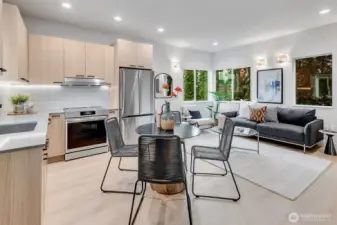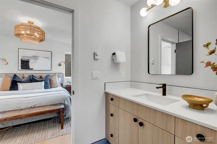 Cedar siding warms the exterior of this architecturally crafted attached ADU, designed for flexibility & modern ease. The main living level is filled with natural light. Open dining & living spaces, and a kitchen anchored by stainless appliances & refined finishes—perfect for everyday living or entertaining. The top floor is devoted to the primary suite, a calm retreat with a lux walk-in shower & integrated laundry space. The entry level hosts a private bedroom with slider access to the outdoors. The adjacent full bath with soaking tub creates an ideal guest suite or home office. Thoughtful details, A/C, dedicated parking, and nearby Light Rail enhance daily convenience. A polished urban dwelling where design, light & livability converge.